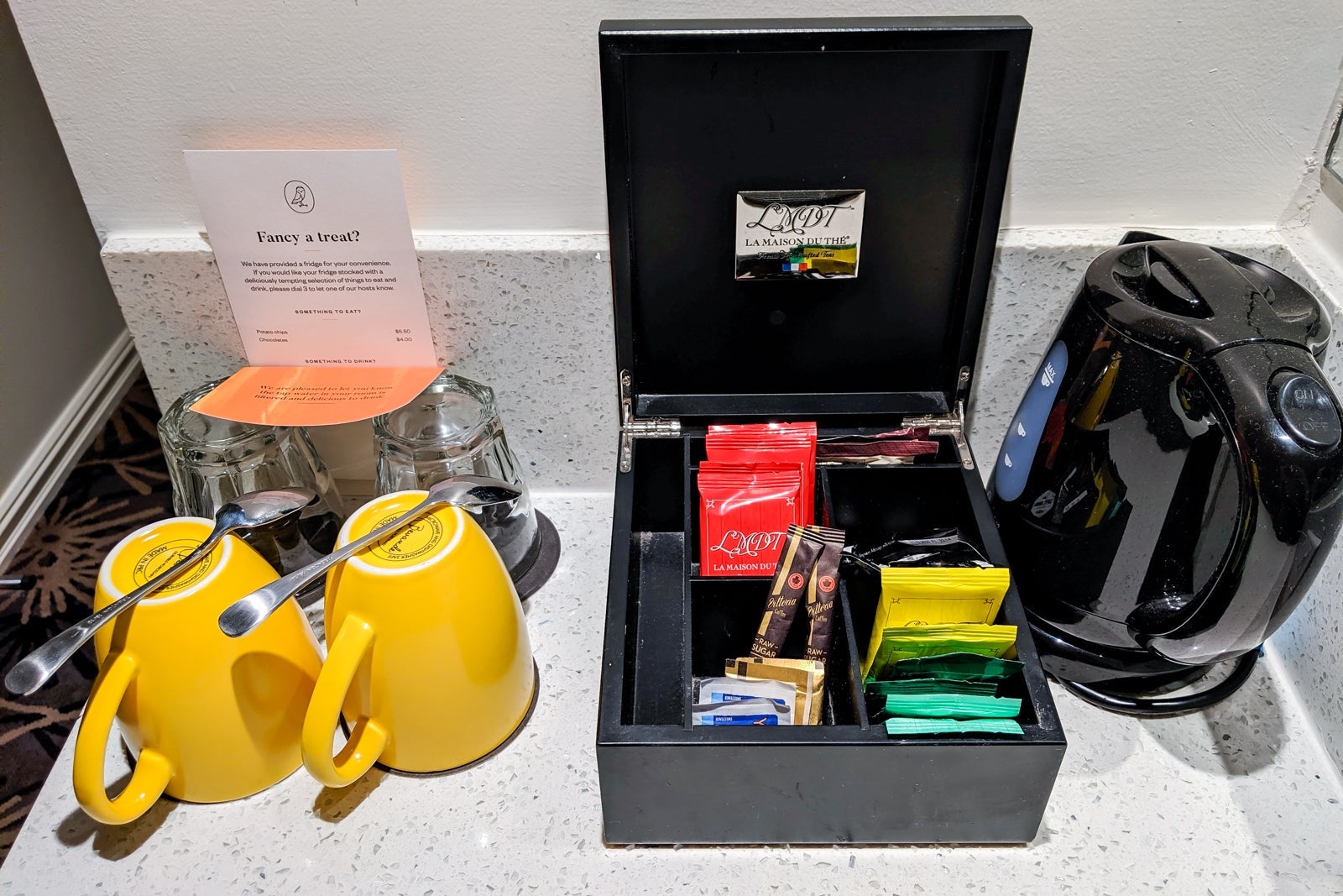Coffee, tea, drinking chocolate, mugs, glasses, spoons and a kettle were provided. In a mostly empty minifridge underneath the dry bar, the hotel provided fresh milk -- as is common in Australia and New Zealand.