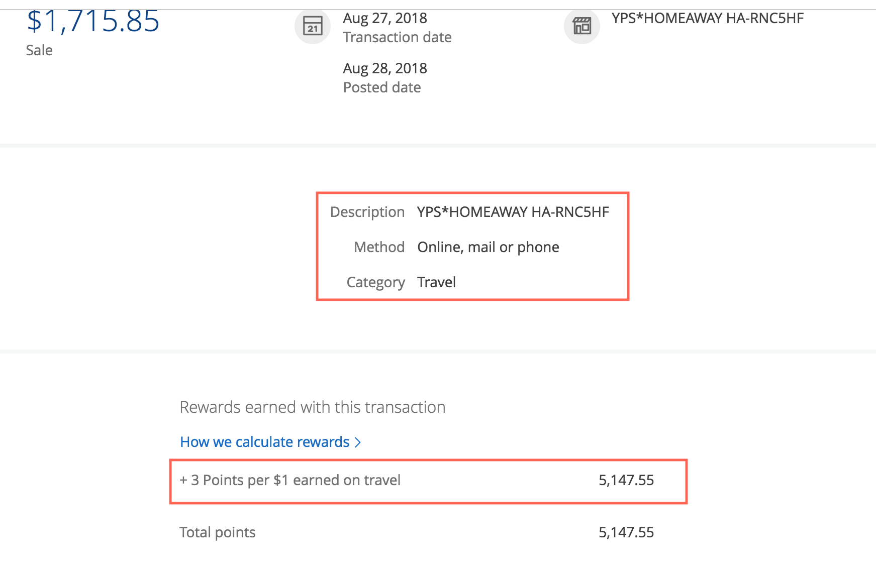 We made our ski vacation home booking through VRBO, but since HomeAway acquired VRBO years ago, the credit card charge posted as a $1,715 charge from HomeAway. I wasn't sure that the charge would code as travel, but I put it on my Chase Sapphire Reserve just in case.