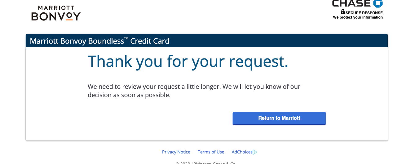 Whatever the reason behind Chase's hesitation, you won't be able to tell from the website; you'll have to wait for up to 10 business days to receive a formal notice in the mail, which will include a brief summary of the issue. You can then contact Chase for more clarification or to offer any supplemental information needed. Sometimes you can appeal the decision; other times, it will be a no-go.