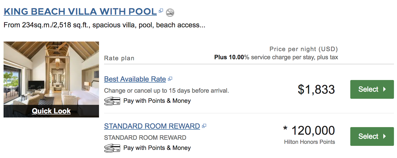 Beginning July 1, 2019, the property is open for bookings. While the cash prices aren't for the faint of heart — a King Beach Villa with pool (the cheapest option) is showing at $1,833 per night, plus taxes and fees — redemptions are much more manageable. On those same dates, the property is showing the redemption rate at 120,000 Hilton Honors points per night.