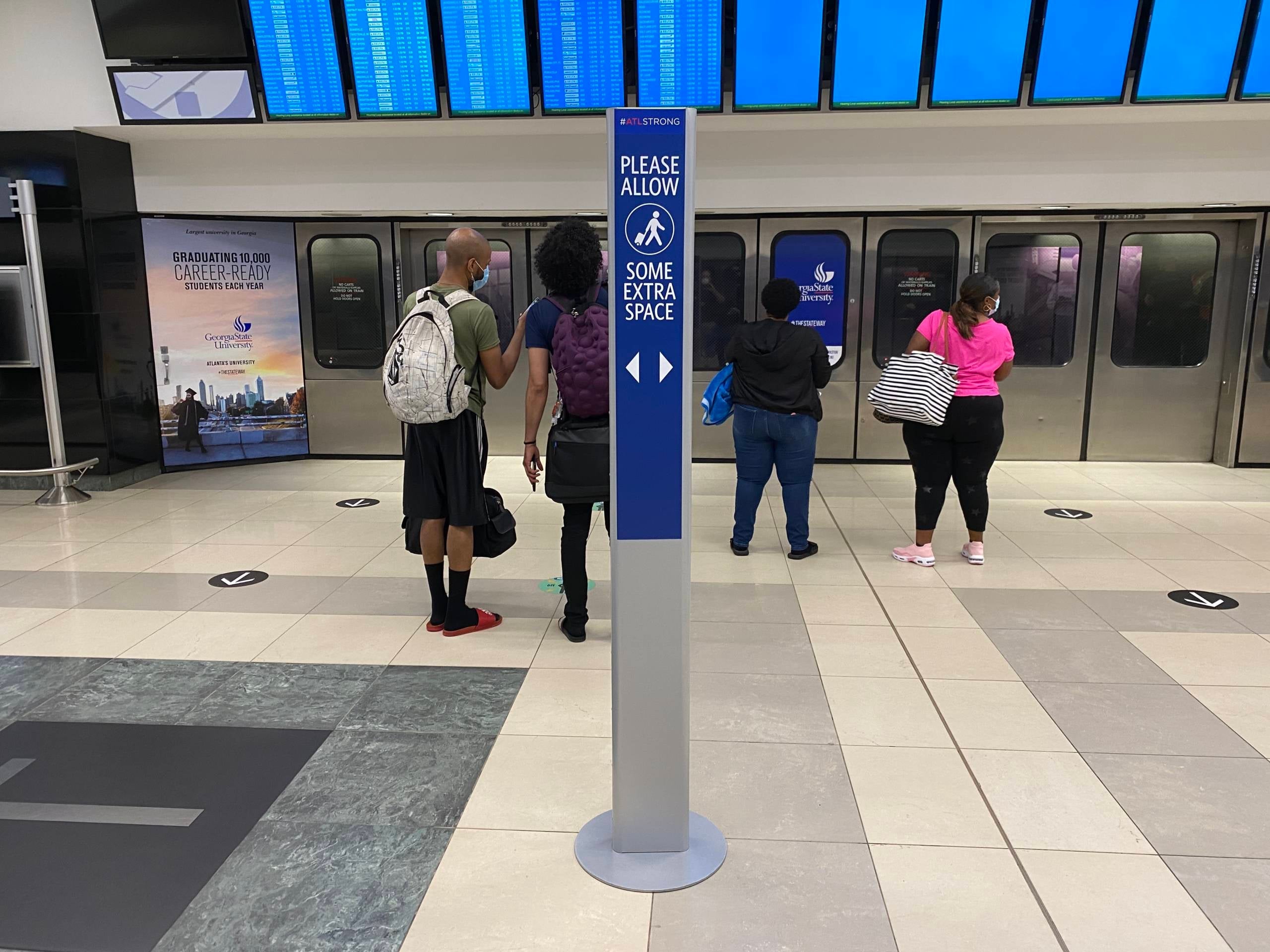 On your way to security it is impossible to miss the social distancing reminders, whether they are on the floor or on signs, as well as hand sanitizers.