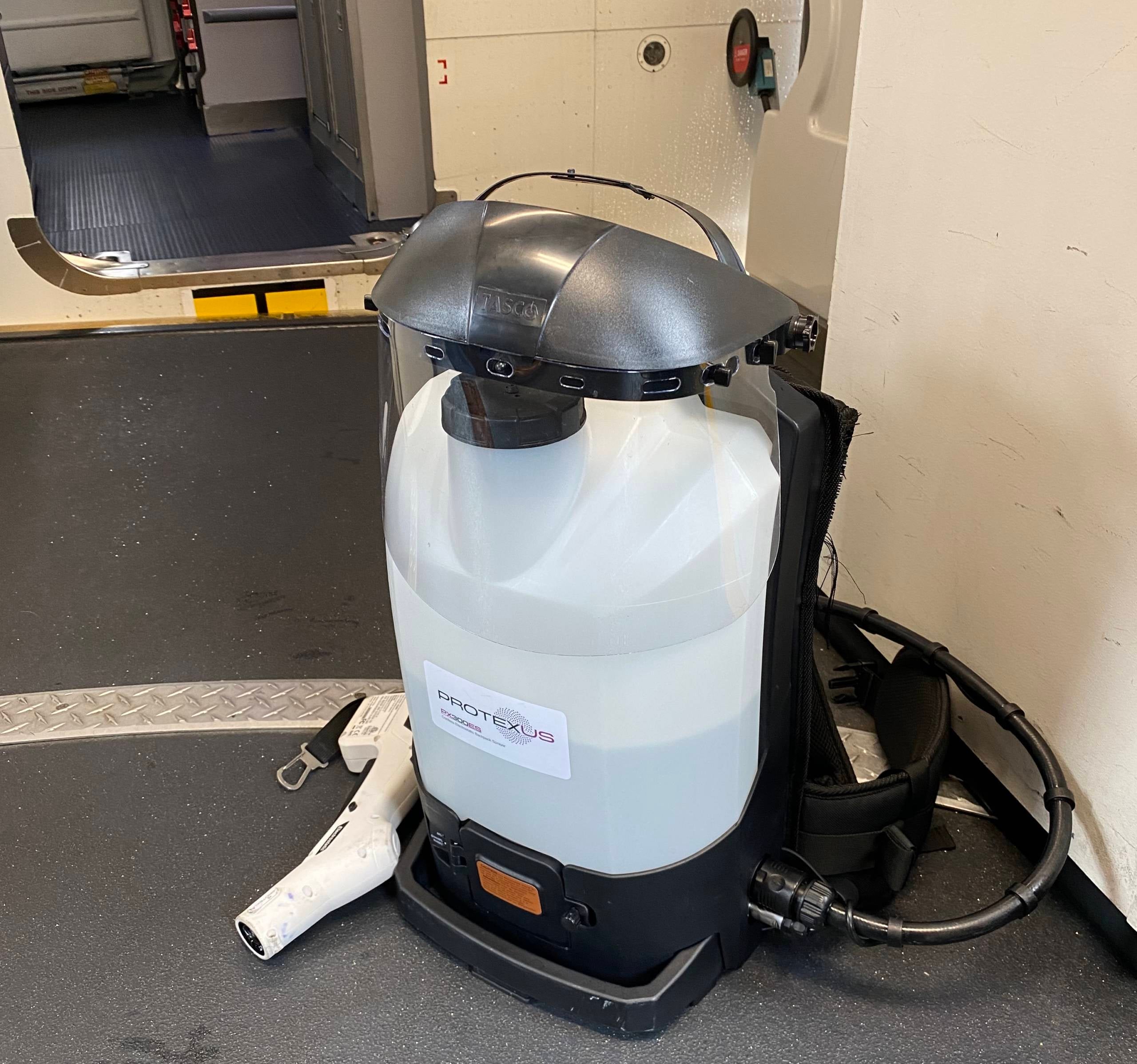 They then use the machines which spray electrically charged, EPA registered liquid disinfectant similar to Clorox in a fine mist. The cleaner clings to the first surface it touches and is no longer visible within 8 seconds of spraying.