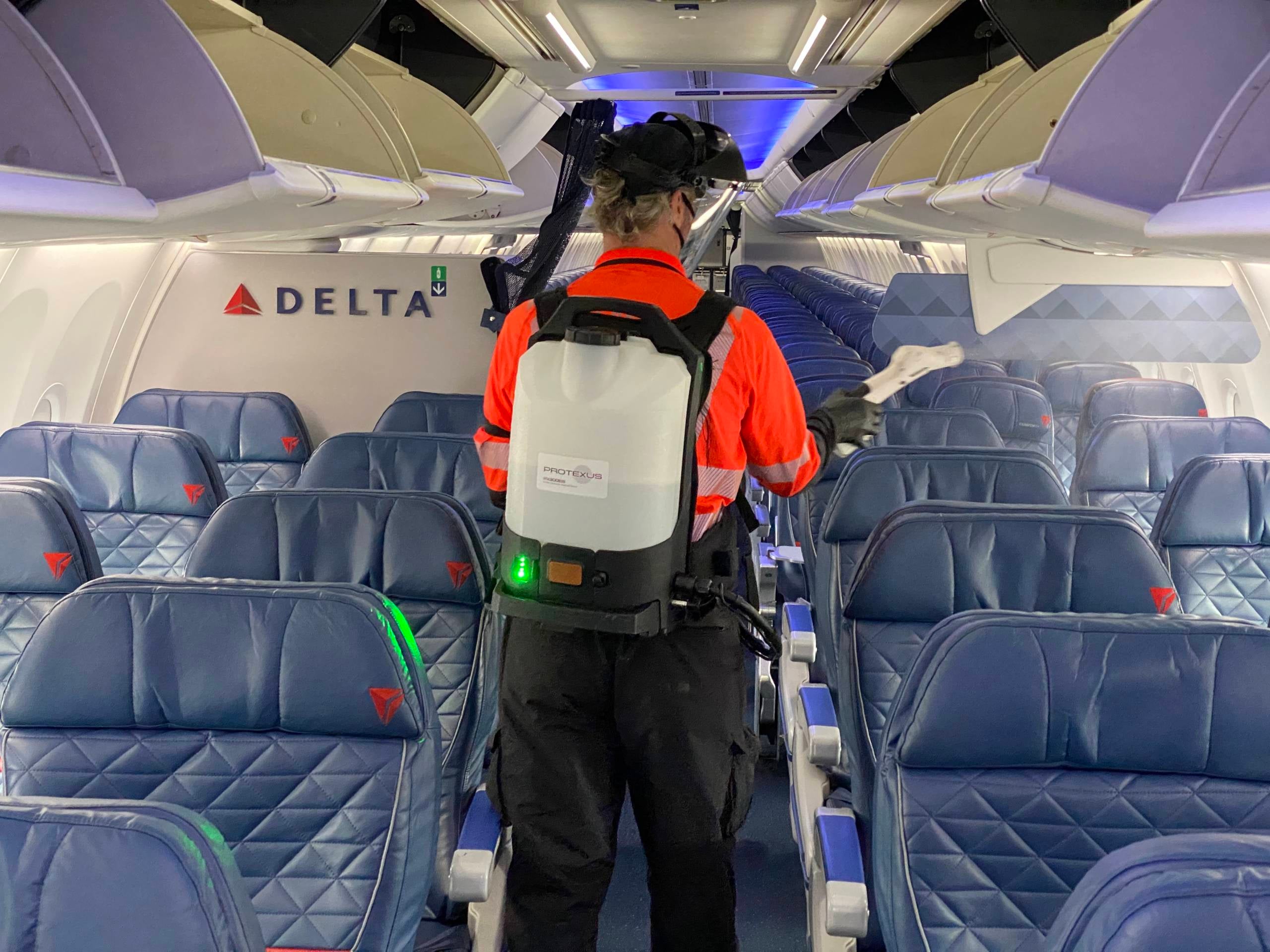 Delta is cleaning every plane between every flight and overnight. The process starts after deplaning when workers with electrostatic sprayers lower every tray table and open every overhead bin. The sprayers I saw were in backpack form and carried about 2.2 gallons of disinfectant which workers said would last them an entire shift.