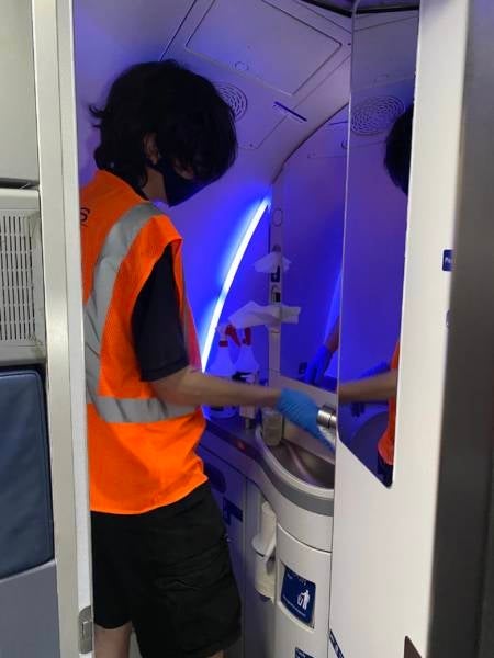 The spraying, however, is only the first part of a two-stage process to clean the plane between every flight. After the airplane is sprayed front to back, a cleaning crew comes aboard and wipes all surfaces and common areas with disinfectant.