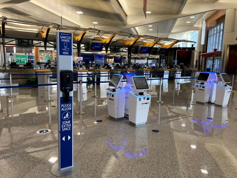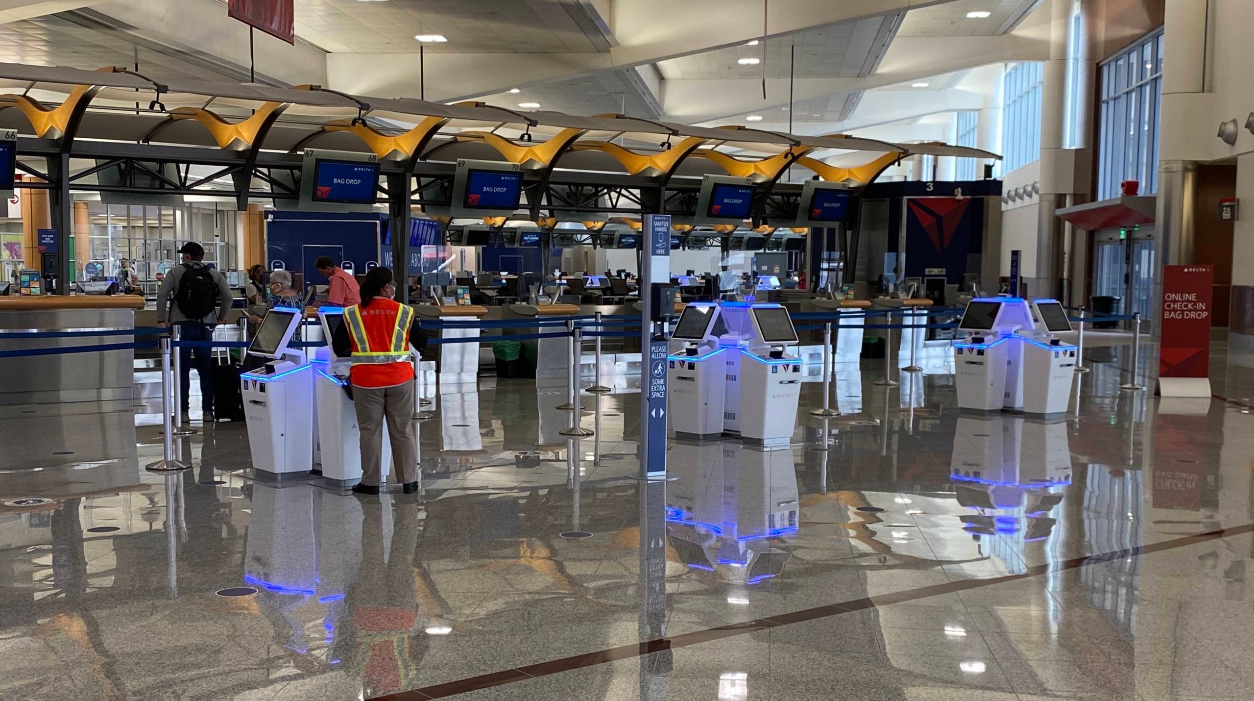 Passengers are also required to wear masks at any Delta interaction point. Staff were circling the check-in area with stacks of what looked like surgical masks in hand to give to any passenger without a mask. The self-service check-in kiosks are also regularly being sanitized. I happened to capture a Delta employee in an orange vest walking around and cleaning the machines during my brief time in the area.