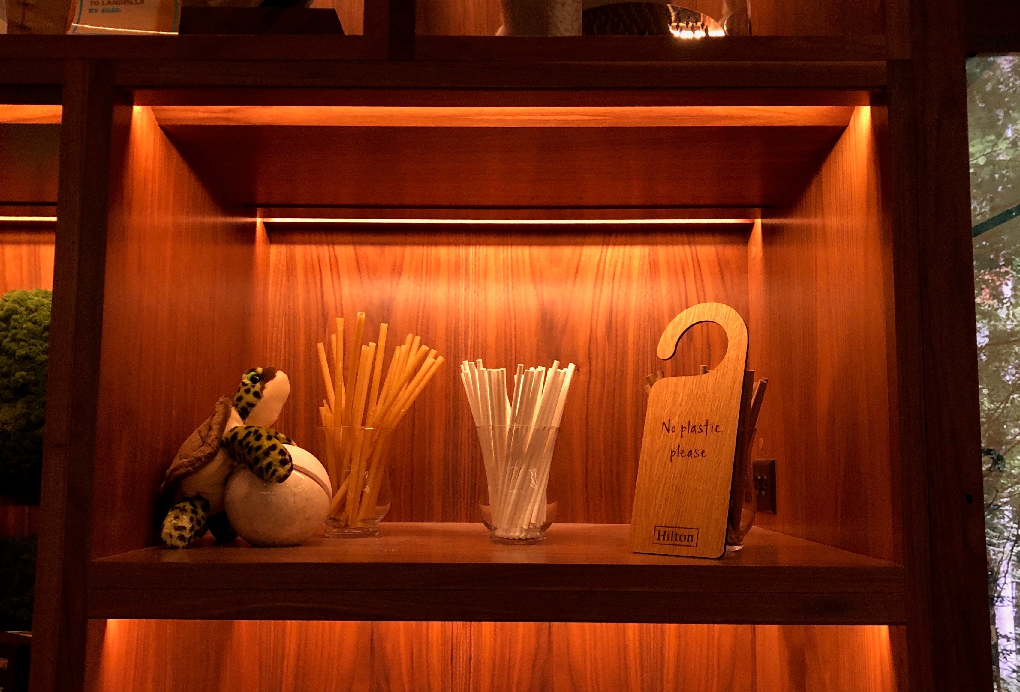 Beyond ample signage asking guests to reuse towels and sheets, Hilton is taking a number of steps to make properties more sustainable. The chain eliminated plastic straws in July, and is looking at other ways to reduce plastic waste, including replacing individual toiletry items in guest room bathrooms. Another concept more common at airports is eliminating free water bottles in rooms -- San Francisco's airport (SFO) went so far as to ban the sale of them in terminals -- and offering refill stations in public spaces.