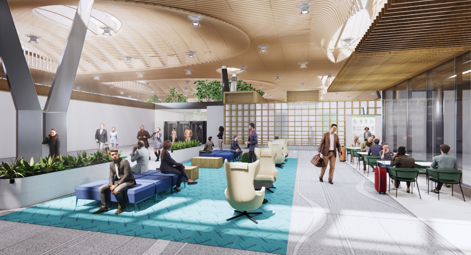 "Carpet can be more challenging for rolling suitcases and wheelchairs. At the same time, it adds a cozy feel and helps with sound insulation," says Simonds. "Ultimately, we settled on places where people would sit or stand and wait. And spaces that wouldn't be considered very high-traffic areas." The pre-security "meet and greet" areas fit the bill. In high traffic areas of the new main terminal, passengers will find terrazzo flooring.