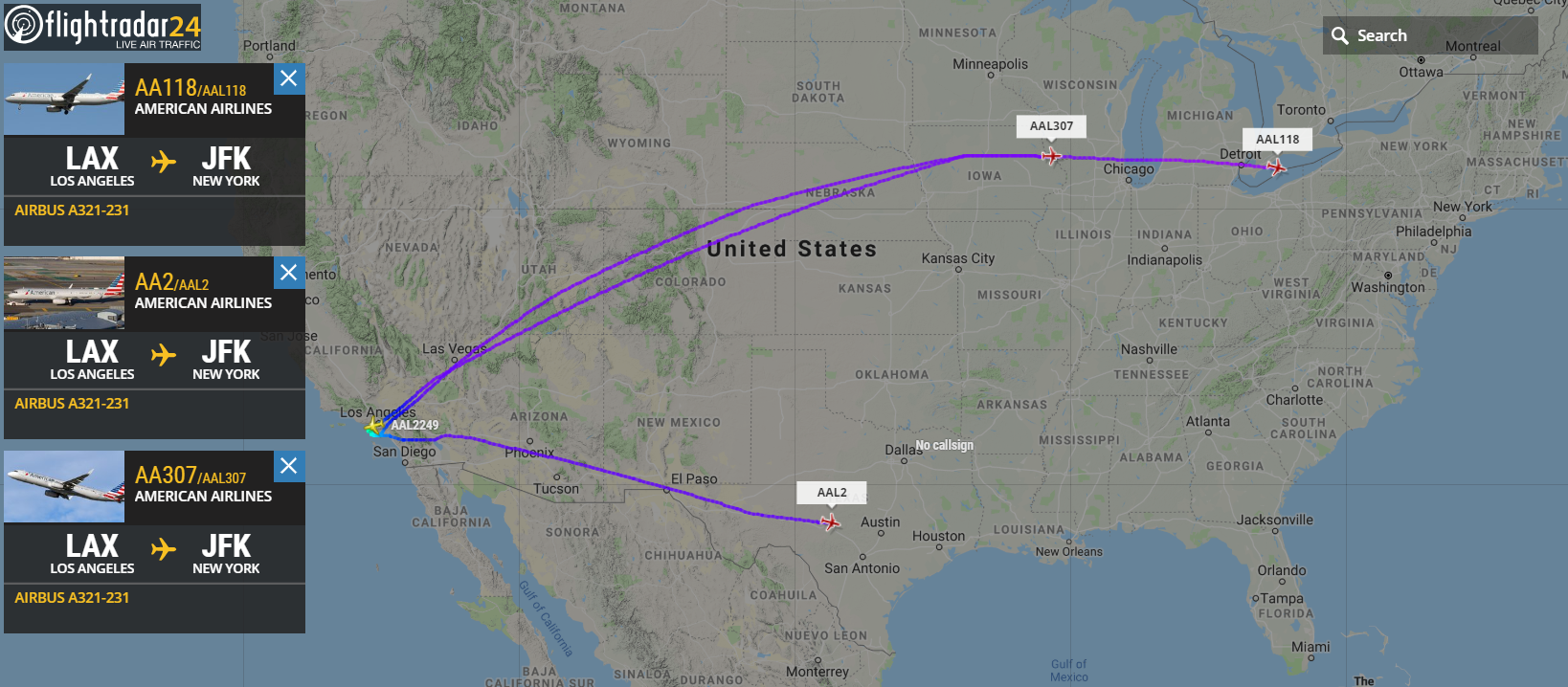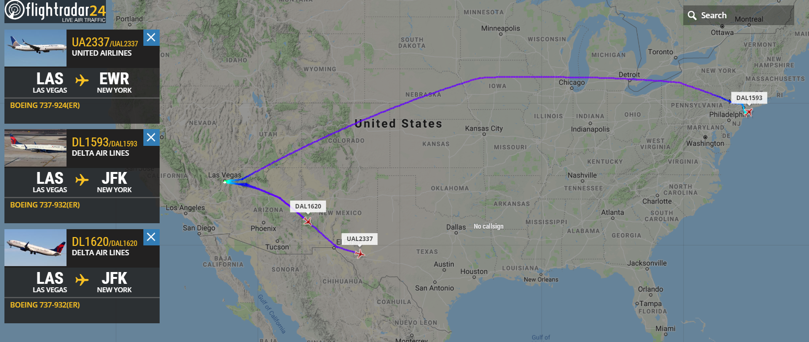 It's not just flights from LAX that are affected. There's current three flights in the air from Las Vegas (LAS) to New York. Delta flight 1593 took a very standard route while United flight 2337 and Delta flight 1620 are playing follow the leader on a southern route: