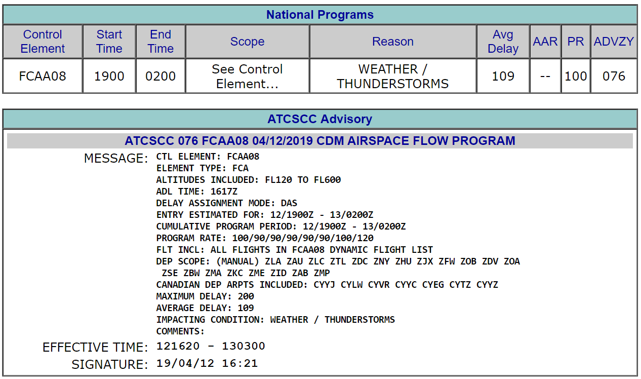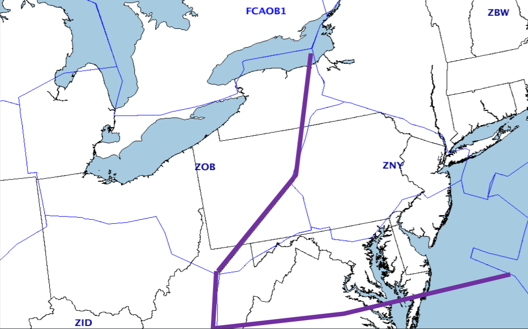 The FAA Air Traffic Control System Command Center is currently showing two air traffic control advisories: FCAA08 and FCAOB1. Any flights that planned to fly above 12,000 feet across these two advisory lines may be affected by these advisories.