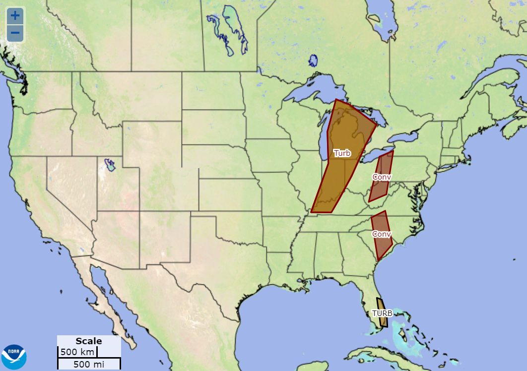Why the crazy routing? The National Oceanic and Atmospheric Administration (NOAA)'s Aviation Weather Center shows two areas of severe convection that are significant enough to warrant a SIGnificant METeorological Information (SIGMET). Plus, there's a broad area of turbulence stretching across the Midwest that flights will want to avoid: