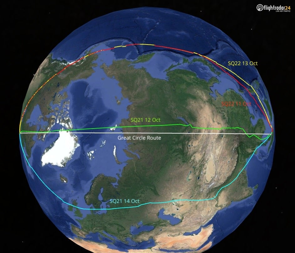 However, due to winds, some flights will take very different routes. One notable example is the world's longest flight between Newark and Singapore. As illustrated and explained by FlightRadar24, Singapore Airlines took exceptionally different routes in the first few days after the re-launch of the route.