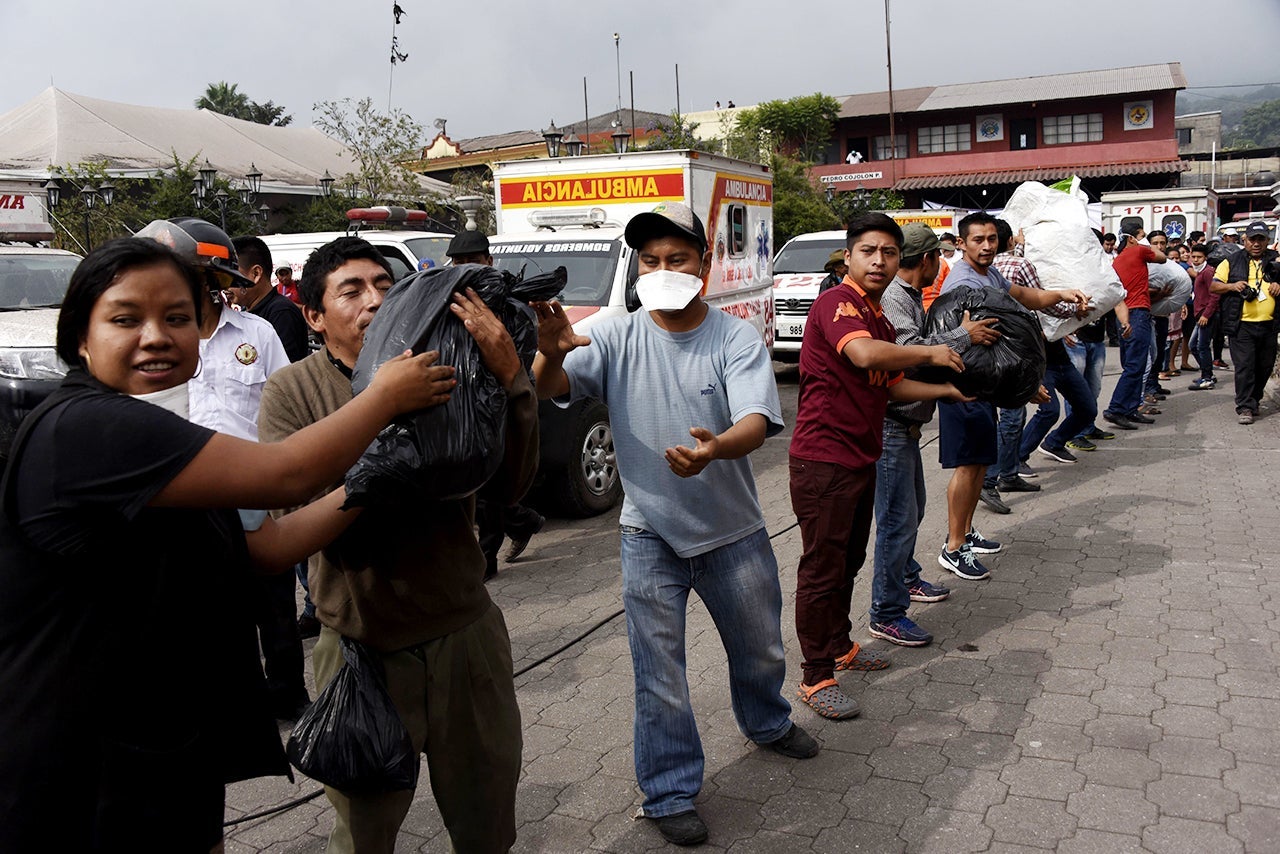 People unload donated supplies for the victims of the eruption of the Fuego volcano, in Alotenango municipality, Sacatepequez. (Photo by JOHAN ORDONEZ/AFP/Getty Images)