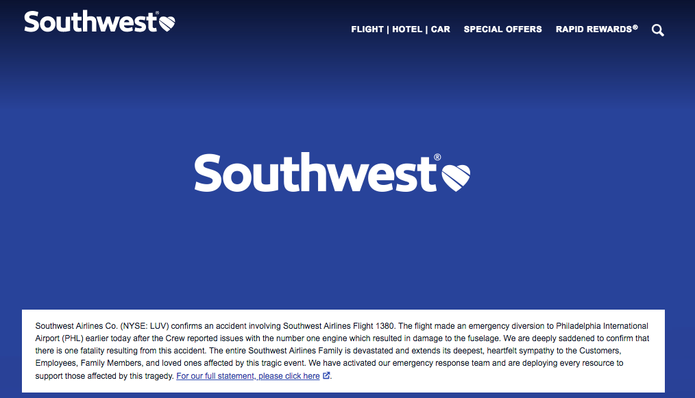 We are deeply saddened to confirm that there is one fatality resulting from this accident. The entire Southwest Airlines Family is devastated and extends its deepest, heartfelt sympathy to the Customers, employees, family members and loved ones affected by this tragic event. We have activated our emergency response team and are deploying every resource to support those affected by this tragedy. For a message from Gary Kelly, Southwest Chairman and Chief Executive Officer, please click here.