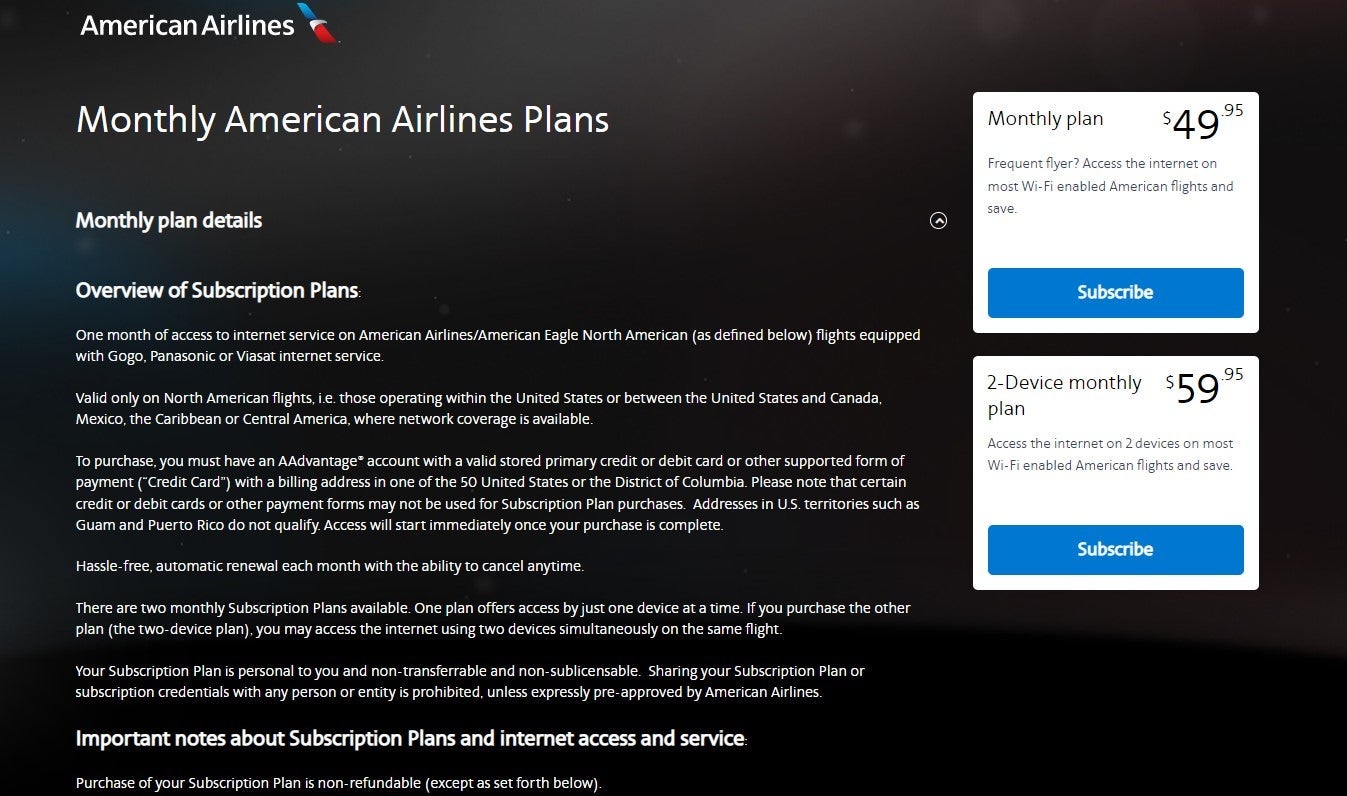 The "Big Three" airlines of American, Delta and United have matched each other on their Wi-Fi subscription pricing of about $50 per month for unlimited access on domestic flights. American's rates are $49.99 per month (or $59.99 per month for two devices), for access in North America, the Caribbean and Central America. Delta's subscriptions sell for $49.95 monthly for coverage in the United States, Canada and Mexico, or $69.95 for international access. United's monthly Wi-Fi subscription is $49 (or 7,500 miles) for coverage in North America, the Caribbean and Central America. United's global plan is $69 per month (or 10,500 miles), with annual plans selling for $539 domestically and $689 internationally.