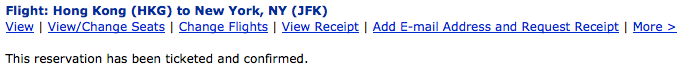 Sunday afternoon: View from the Wing blog reports that a reader was able to purchase an award from China to the US in United First Class for 4 miles and $29.60 cents. What a steal! I was able to book a Hong Kong- JFK First class ticket at 1:33pm ET on Sunday and posted about my success as word began to spread through the blogosophere and social media. Shortly before 3pm ET, United disabled the error and even took out Hong Kong as a destination on united.com as they sorted the issue out. Everyone who was able to book was officially in "wait and see" mode because you never really know how these will play out. Several people booked travel for Sunday evening and they were able to print boarding passes and fly without issues. A promising sign.