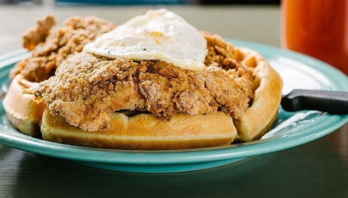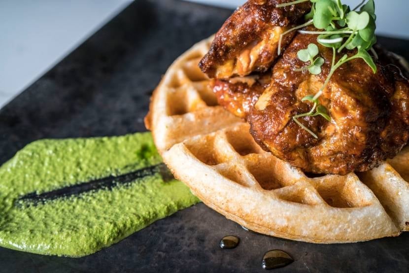 Rahi's Uttapam Waffles: lentil & rice waffle, curry leaf chutney, maple + masala fried chicken / fried eggs.