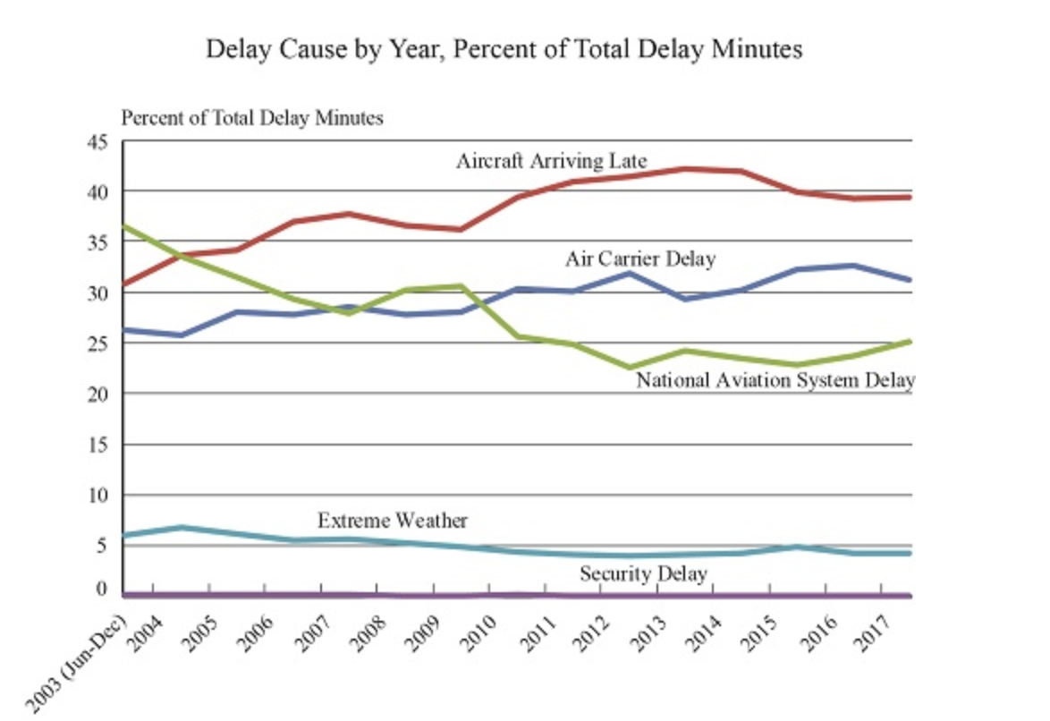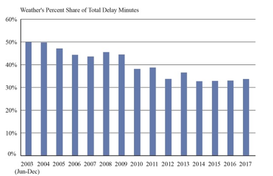 The percentage of delays due to extreme weather is going down, in fact, as the table below shows:
