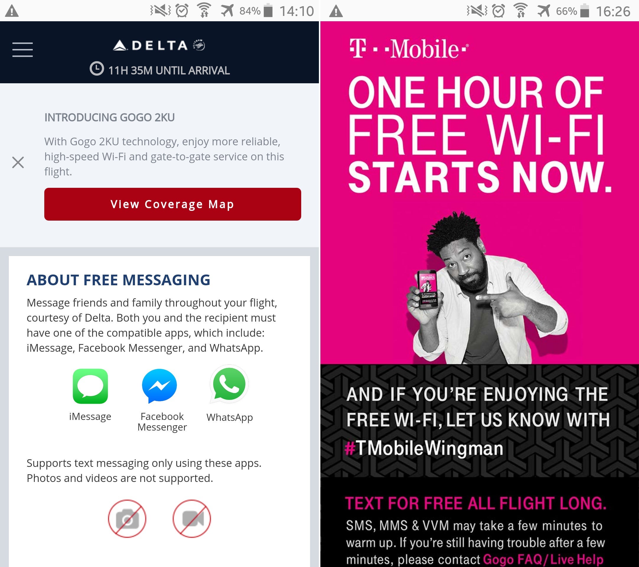 Pricing for Delta's Wi-Fi varies flight to flight, but messaging applications like iMessage, Facebook Messenger and WhatsApp are free for the entirety of the flight, although only for text, without images. Delta breaks out its 2Ku pricing into a "Browse" and "Stream" pass, so you'll have to cough up a few bucks extra to unlock Netflix. If you are a T-Mobile customer, though, you have one hour of free Wi-Fi.