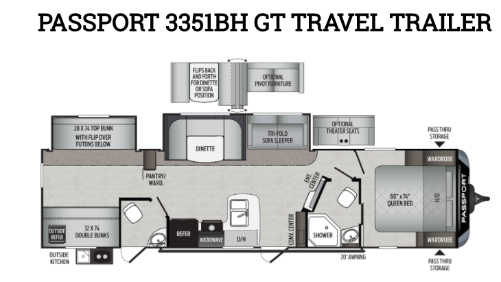 That leads us to Betty: our new 37-foot Passport Grand Touring 3351BH bunkhouse floor plan travel trailer.