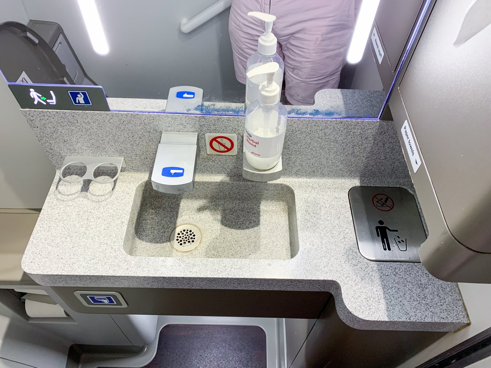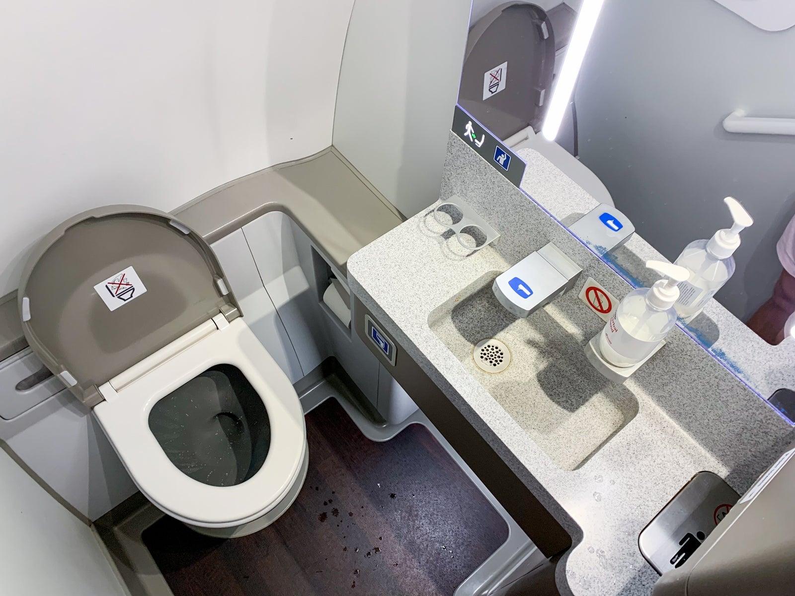 No, you won't find a shower or urinal or powder area in an A220 bathroom. Nonetheless, you'll be pleasantly surprised by the bathrooms on the A220. They feel larger and taller than other similarly sized short-haul aircraft.