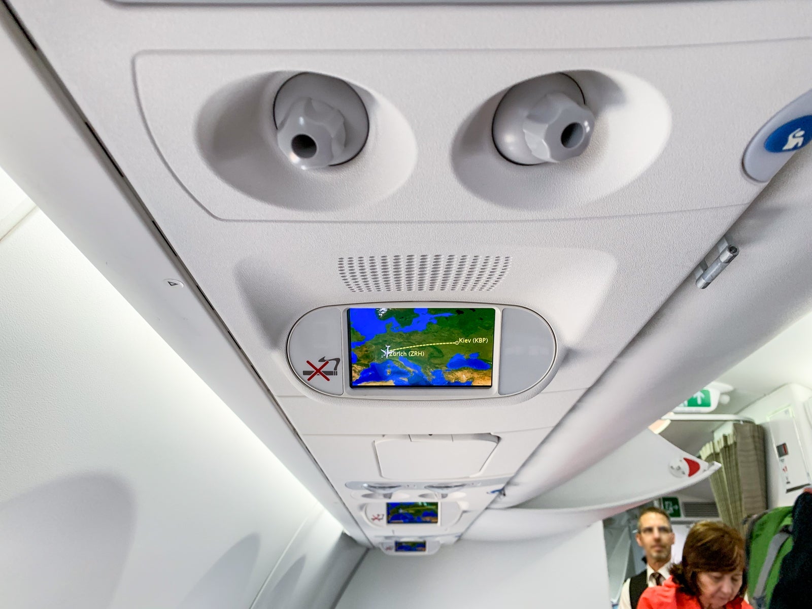 Flying the A220 felt like I was on a plane built in the last decade. Aside from how fresh and clean the cabin looked, there were small screens near the passenger service unit displaying a looping route map. The chrome finishes that Swiss chose added to the modern feel as well.