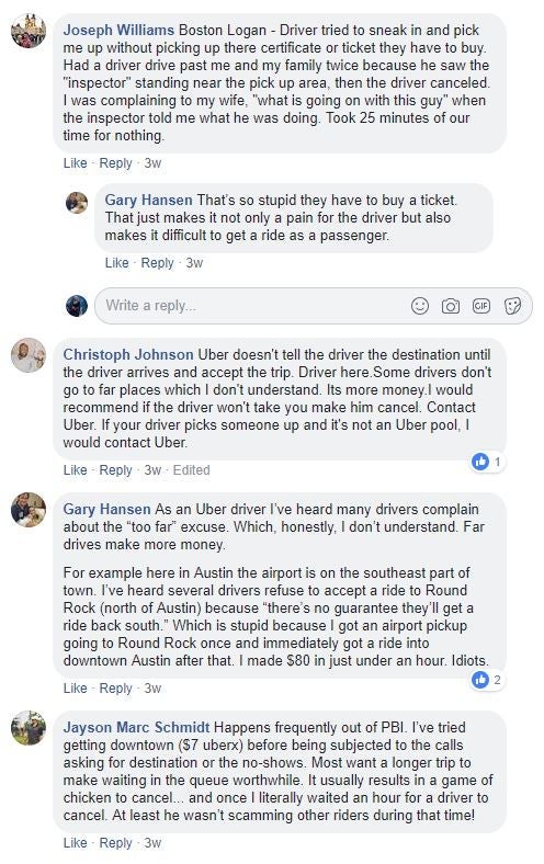 "There are Uber drivers who sit in the cell phone waiting lot outside of LAX all day. They accept rides, then message/call the passenger and request the passenger's destination address (this is already against Uber's Terms of Service for drivers!). After you give the address, the driver will say it's 'too far' and they request the passenger cancel the ride. (My office is less than 2 miles from LAX — definitely not too far.) When the passenger cancels, they're charged the $5 inconvenience fee and the driver makes $4 per cancellation by just sitting in the lot. I have screenshots of two different drivers over the past few weeks who have tried to pull this on me — wrote it off the first time but it happened again yesterday and the passenger next to me said the same thing had happened to her. I've contacted Uber multiple times about this but I don't have the influence to make them do anything."
