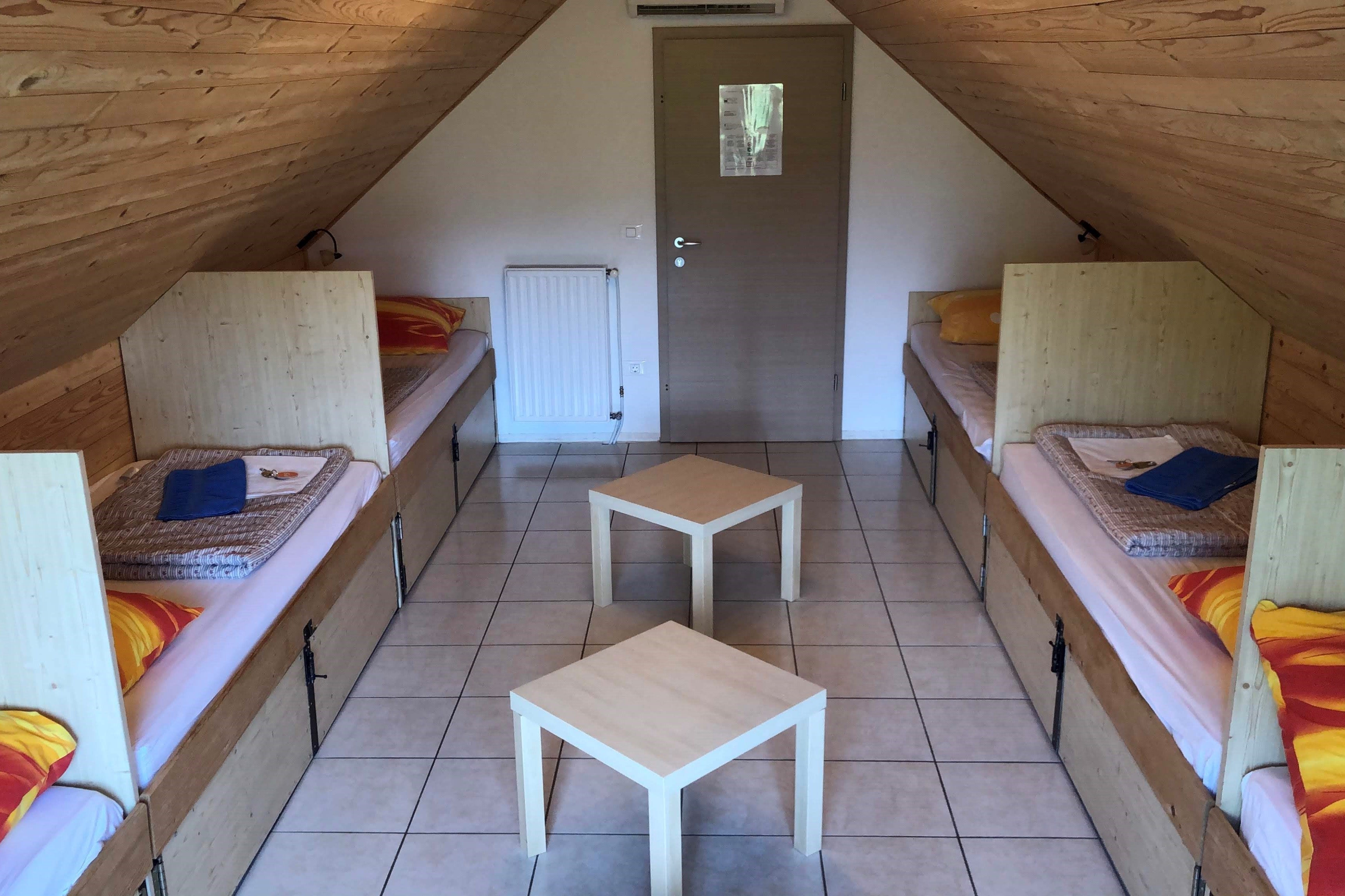 Consider this: the Jazz Hostel in Lake Bled, Slovenia. This room can be shared comfortably by six people, with communal bathrooms and showers.