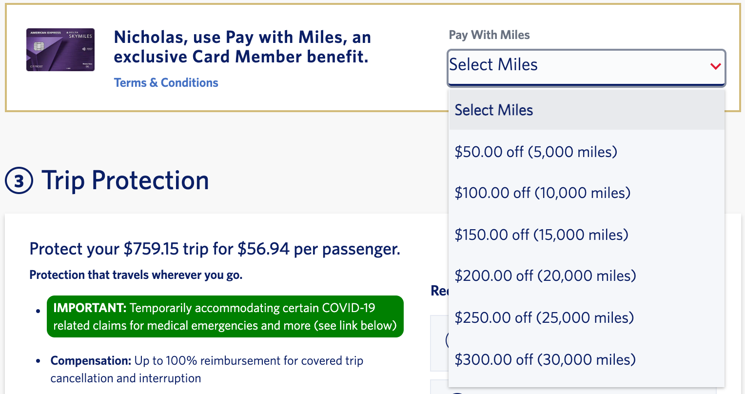 An oft-overlooked feature of Delta's SkyMiles program, Pay With Miles allows cardmembers of any Delta and American Express cobranded cards to pay for a portion (or all) of a ticket on a Delta or Delta Connection-operated flight with SkyMiles at a value of one cent per point.