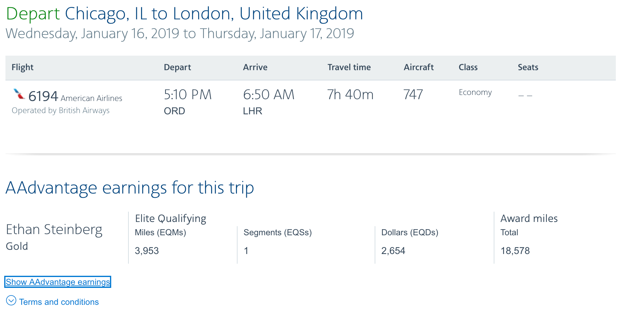 If you were to book through AA, even though the flight is operated by a partner airline, you'd earn miles just the same as if you were flying on AA. This works out to 1 EQM per mile flown and 1 EQD per dollar spent on base fare (excluding taxes). Since I'm a Gold elite with AA, I'd also earn 7 redeemable AA miles per dollar spent on base fare.
