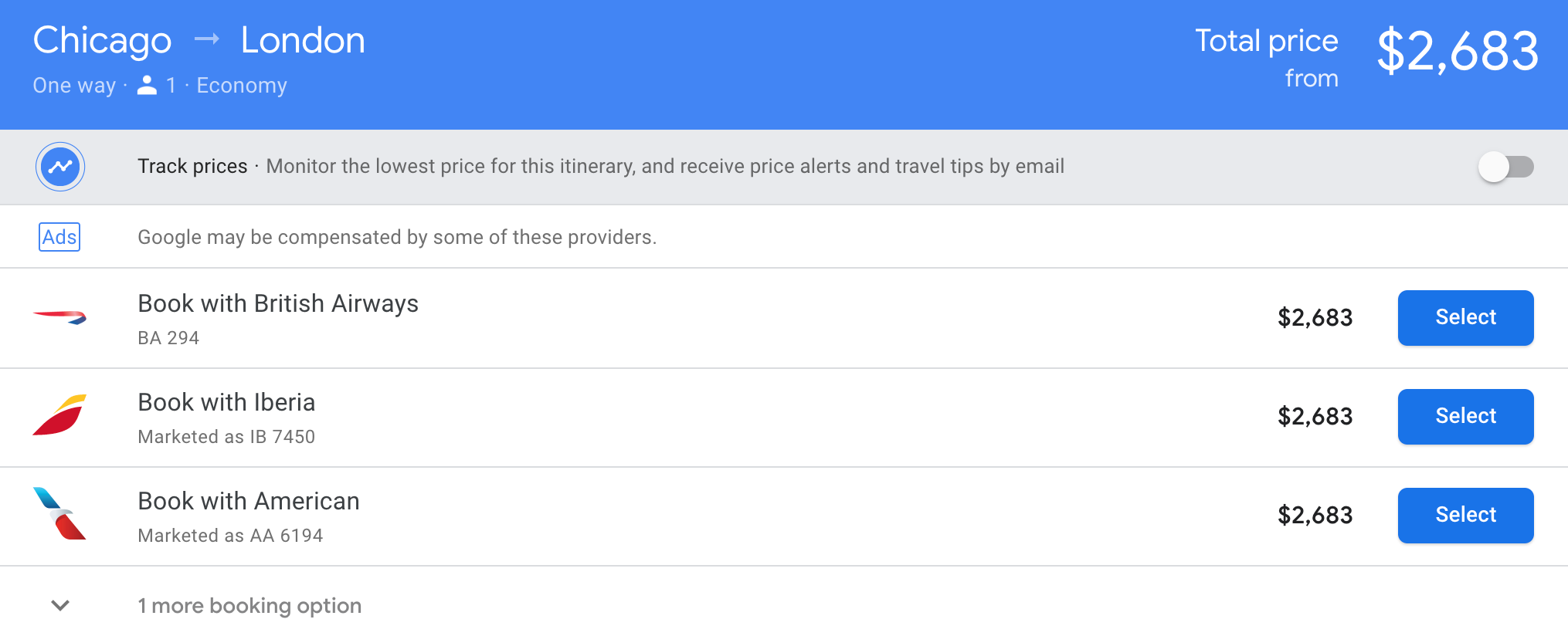 Take this flight from Chicago (ORD) to London (LHR), in the Y economy fare bucket. It costs the exact same amount whether you book through British Airways, Iberia or American Airlines.
