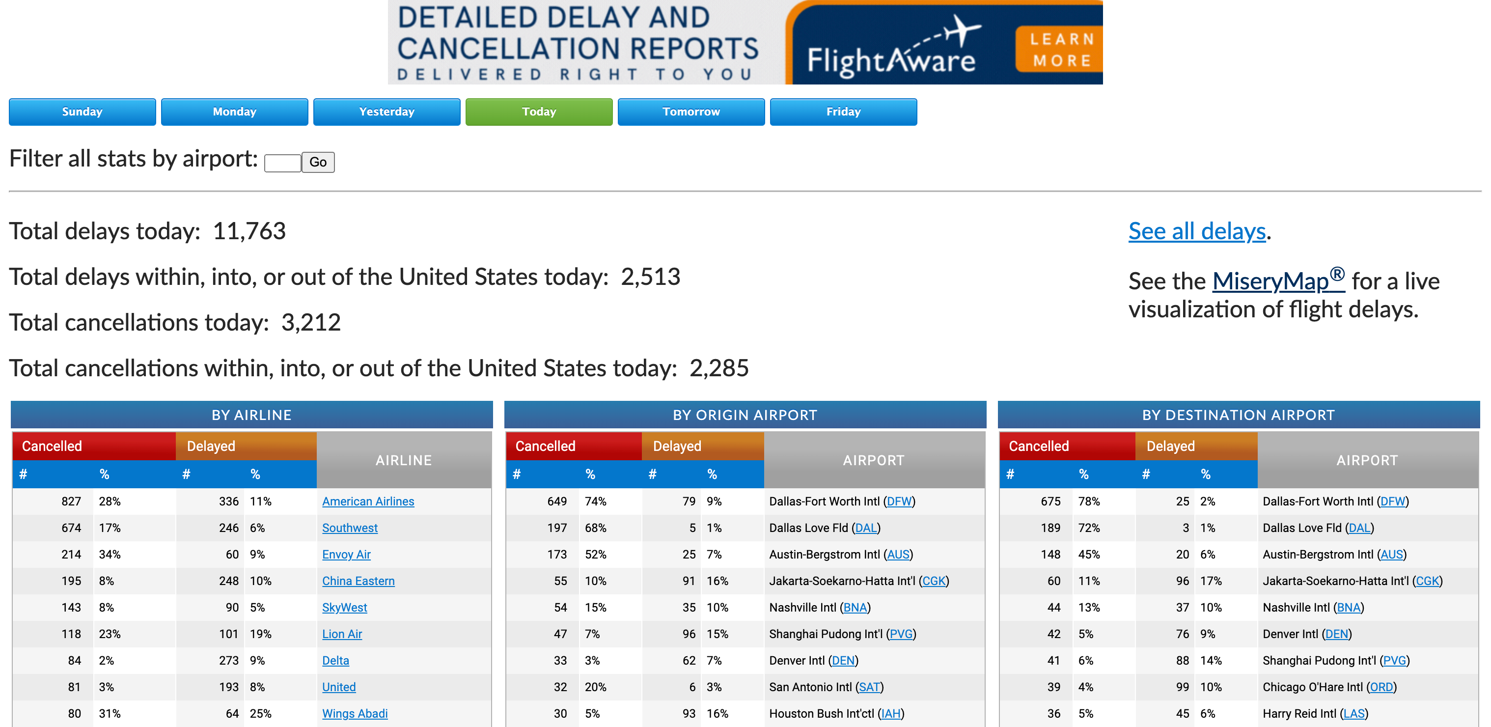 Currently, the three worst-hit airports are Dallas-Fort Worth International (DFW), Dallas Love Field (DAL) and Austin Bergstrom International (AUS).
