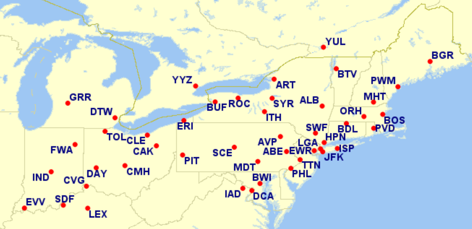 - Airports affected: Akron / Canton, Ohio (CAK); Albany, New York (ALB); Allentown, Pennsylvania (ABE); Baltimore, Maryland (BWI); Bangor, Maine (BGR); Boston, Massachusetts (BOS); Buffalo, New York (BUF); Burlington, Vermont (BTV); Cincinnati, Ohio (CVG); Cleveland, Ohio (CLE); Columbus, Ohio (CMH); Dayton, Ohio (DAY); Erie, Pennsylvania (ERI); Evansville, Indiana (EVV); Fort Wayne, Indiana (FWA); Harrisburg, Pennsylvania (MDT); Hartford, Connecticut (BDL); Indianapolis, Indiana (IND); Islip, New York (ISP); Ithaca, New York (ITH); Lexington, Kentucky (LEX); Louisville, Kentucky (SDF); Montreal, Ontario Canada (YUL); New York Kennedy, New York (JFK); New York LaGuardia, New York (LGA); Newark, New Jersey (EWR); Philadelphia, Pennsylvania (PHL); Portland, Maine (PWM); Rochester, New York (ROC); State College, Pennsylvania (SCE); Stewart Newburgh, New York (SWF); Syracuse, New York (SYR); Toledo, Ohio (TOL); Toronto, Ontario Canada (YYZ); Washington Dulles, Washington D.C. (IAD); Washington Reagan, Washington D.C. (DCA); Watertown, New York (ART); White Plains / Westchester County, New York (HPN); Wilkes-Barre / Scranton, Pennsylvania (AVP)