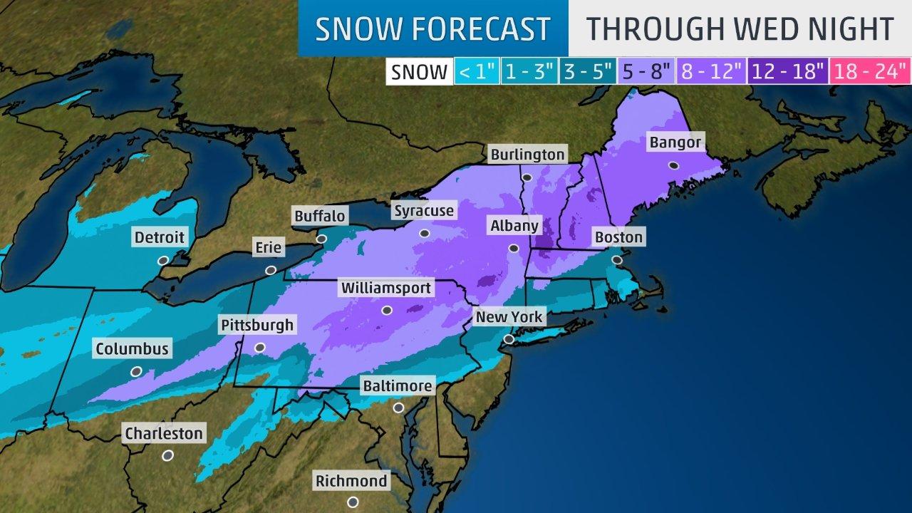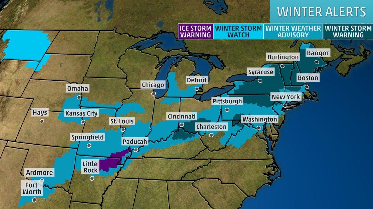 The National Weather Service has issued winter storm warnings, winter weather advisories and ice storm warnings for the following stretch from Texas to Maine: