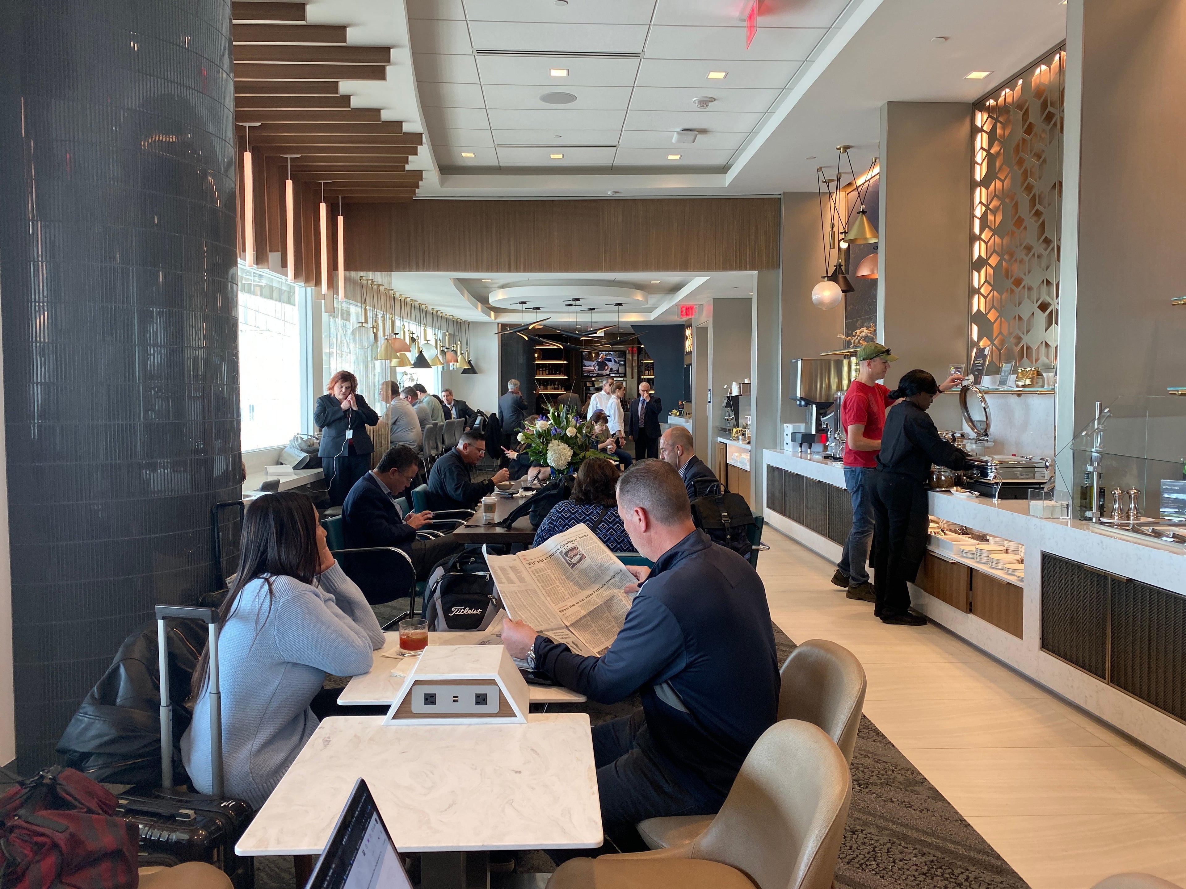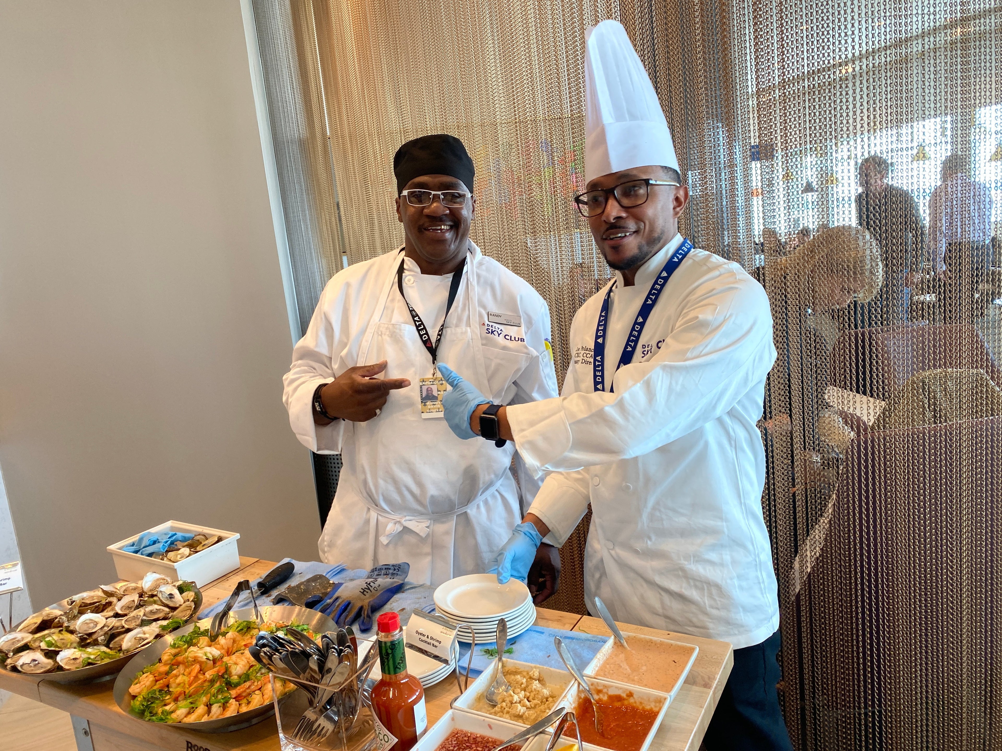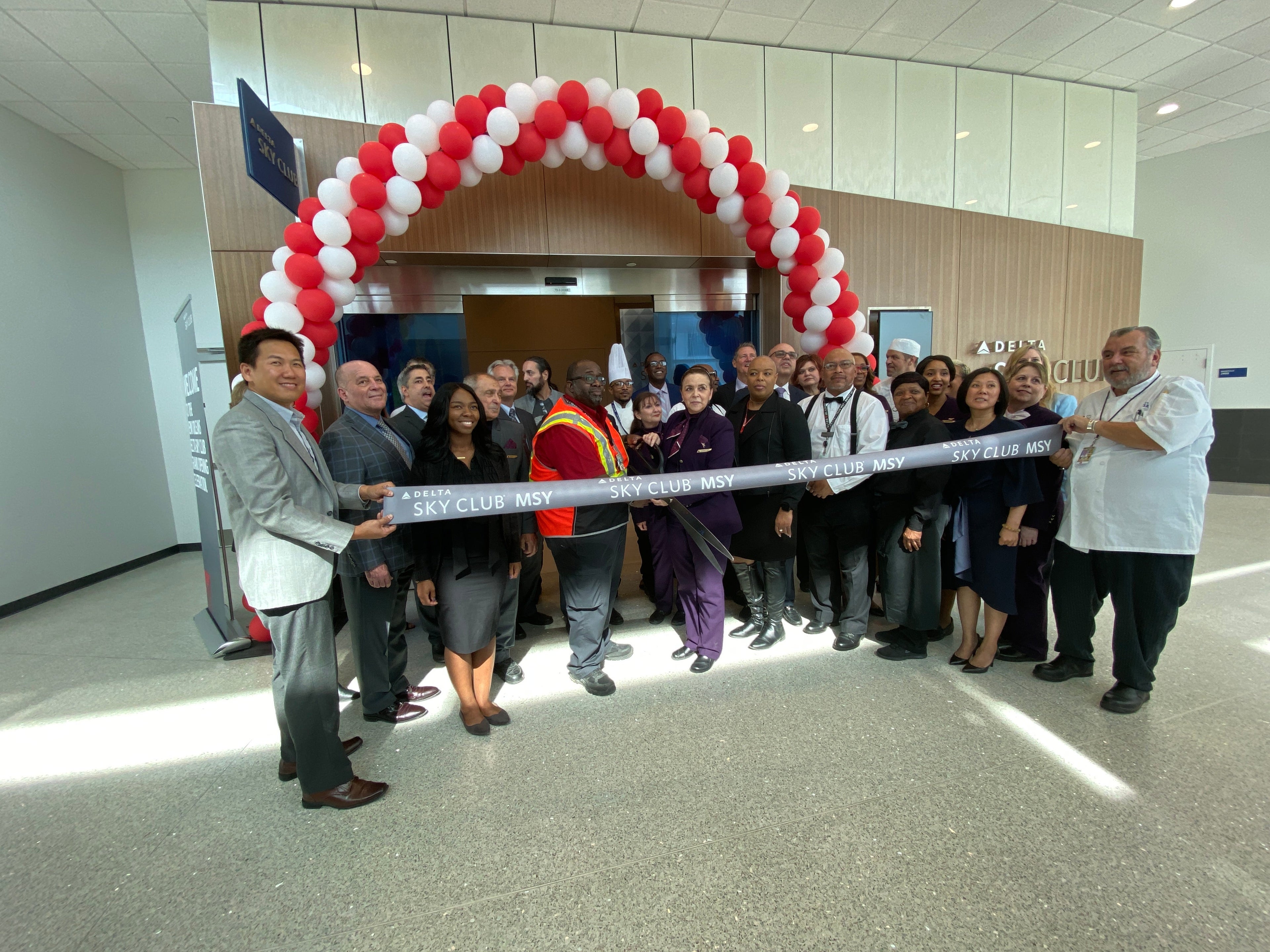 Currently, MSY's only airport lounge is Delta's dazzling new Sky Club at the entrance to Concourse C, which we previewed yesterday. It opened promptly at 5 a.m. The staff took time out for a group photo and ribbon cutting when they weren't busy passing out hors d'oeuvres.