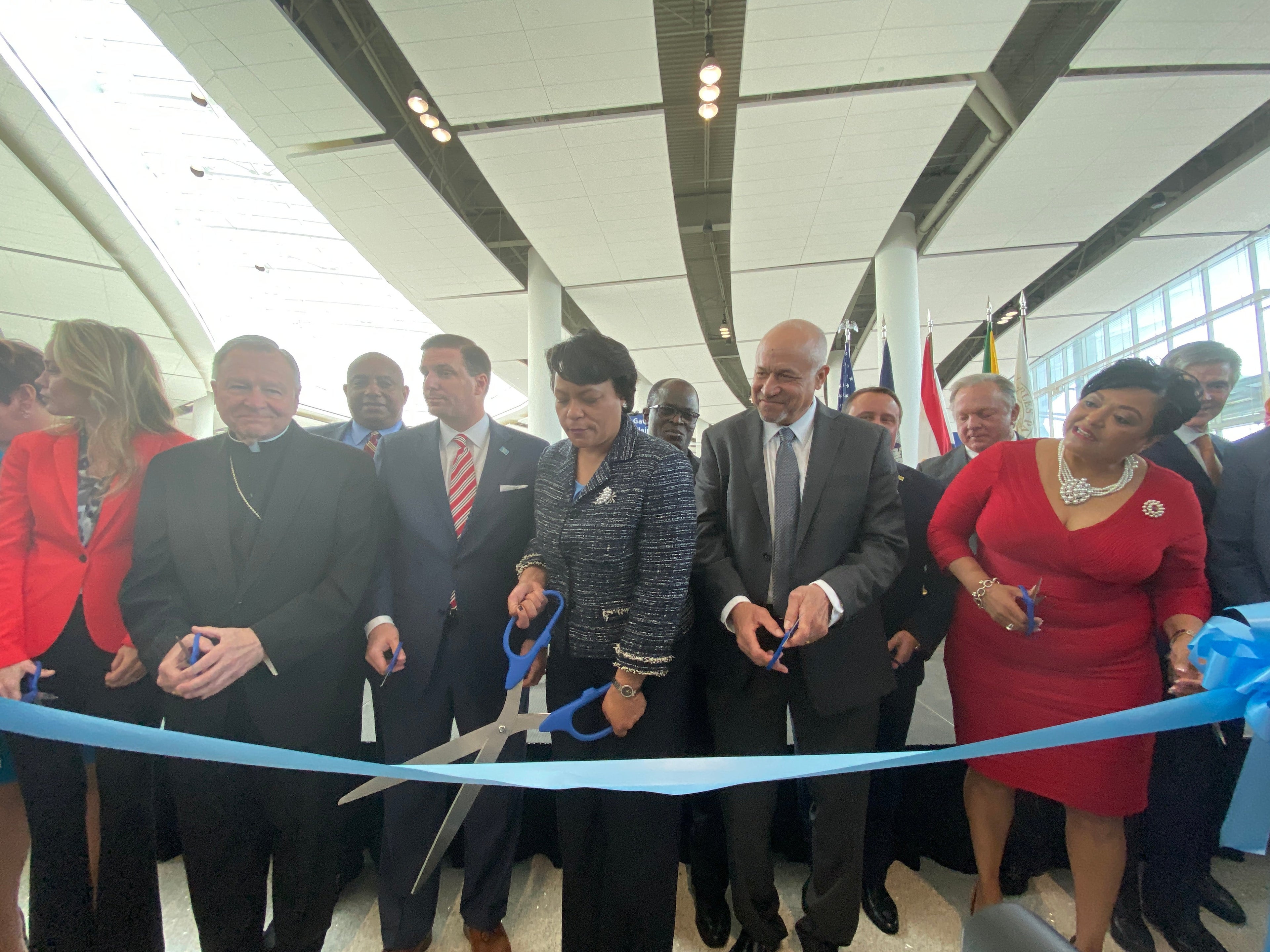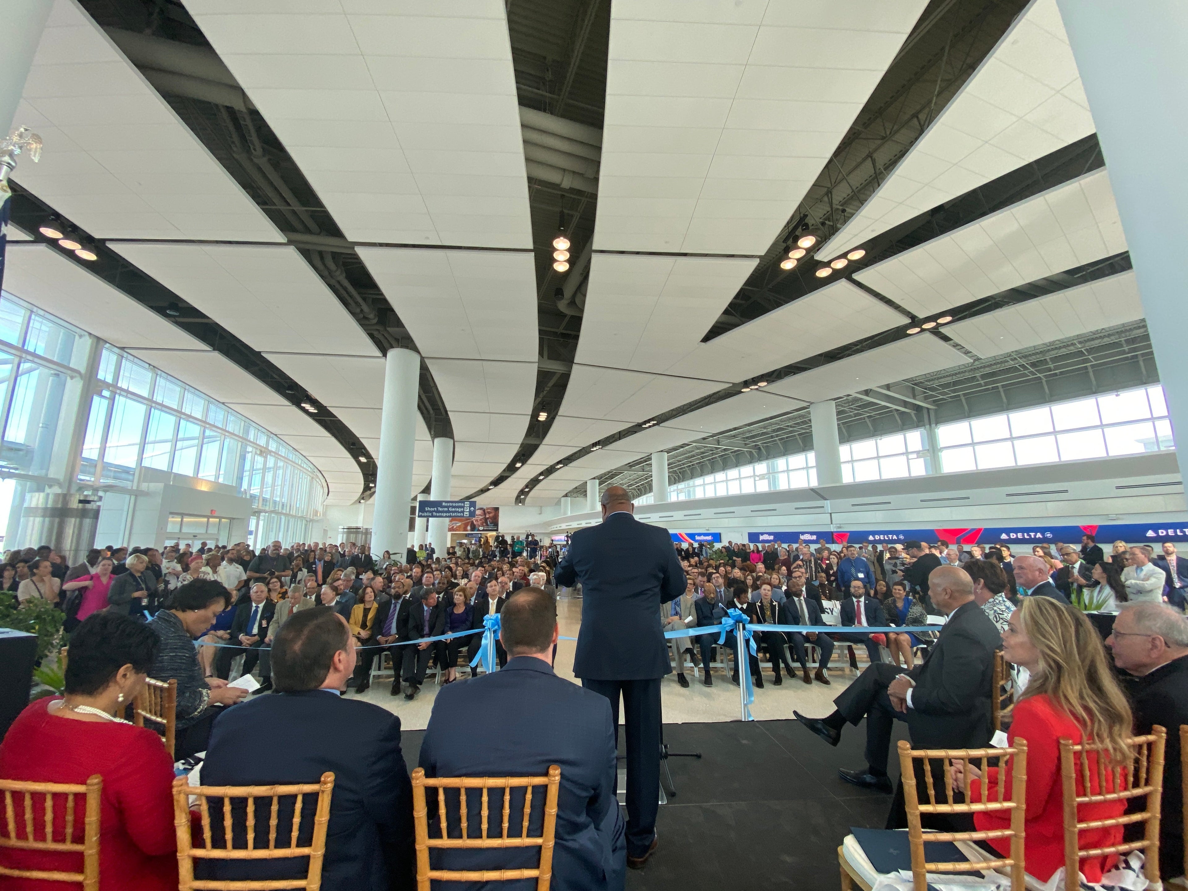 The Wednesday opening of the new terminal was more than a decade in the making, coming only after a series of delays pushed back the expected date several times. Officials dedicated the new showpiece facility Tuesday with a ribbon-cutting, and several arrivals used the new terminal. But the terminal was feted with splashy, jazz-inflected ceremony on Wednesday.