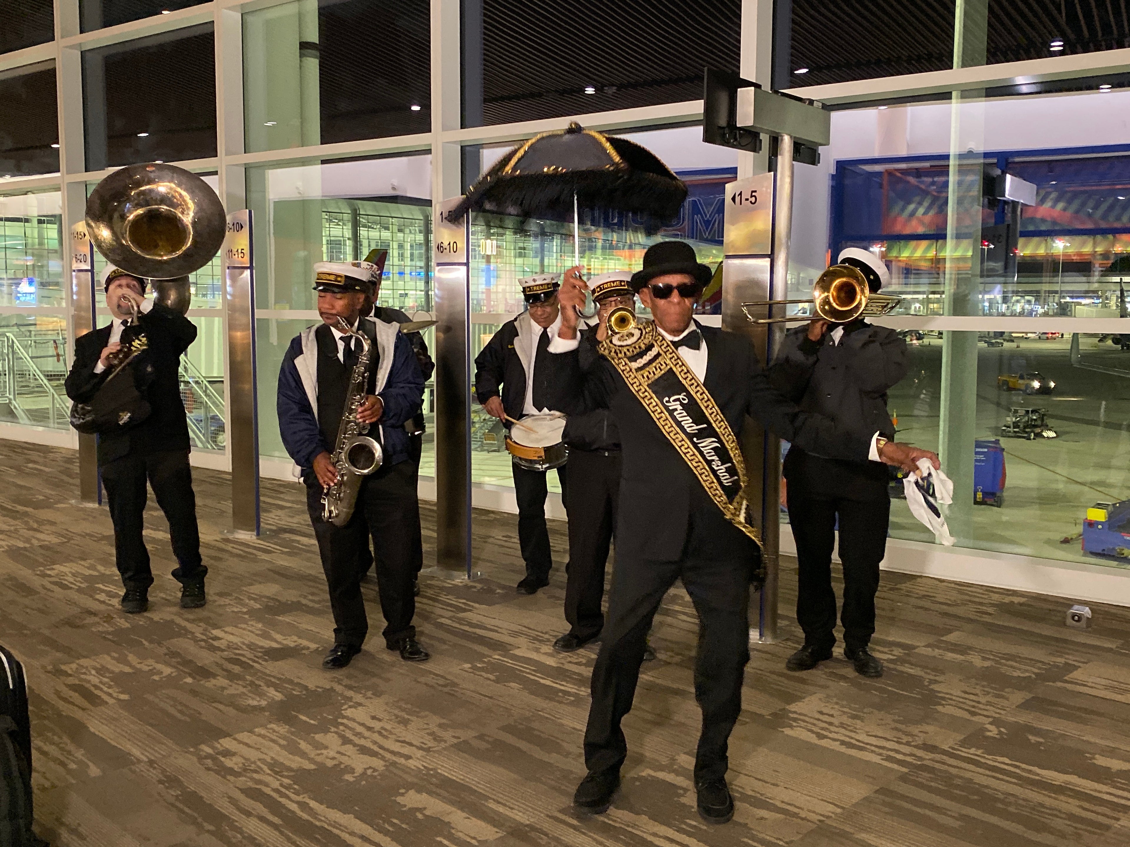 To christen the new terminal at the unholy hour of 4 a.m., another second-line band performance woke everybody up ahead of the inaugural flight.