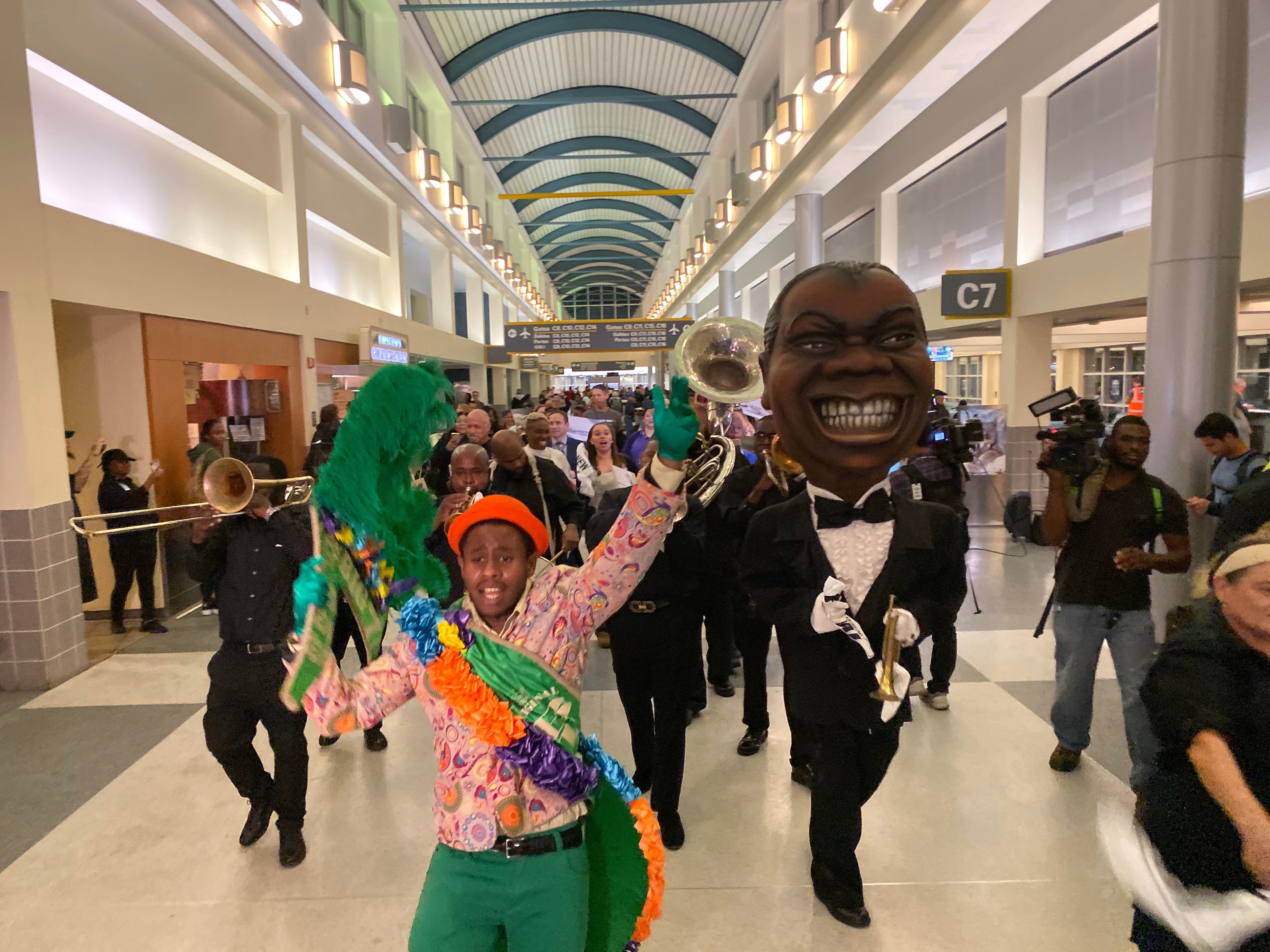 The ceremony's crescendo came with a New Orleans-style jazz procession to the arrivals area that got everyone dancing.