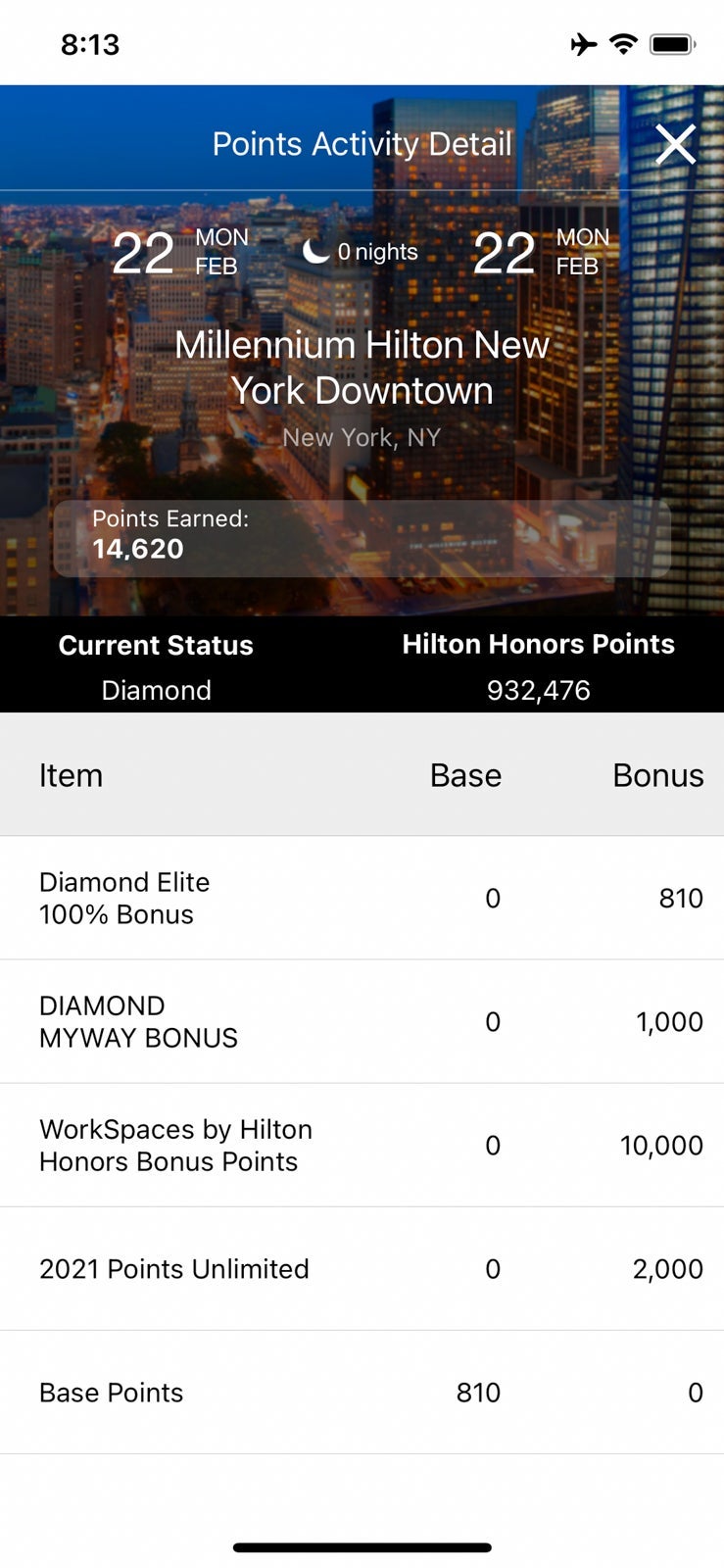 The most-lucrative stay, however, was my Hilton one. My base rate was $81, earning 810 points. Then I got 810 extra points as a Diamond elite member and 1,000 points for my welcome amenity. There was another 2,000 points for the "Points Unlimited" promotion, which gives 2,000 bonus points for each stay and an additional 5,000 bonus points every five nights, But it gets even better. Hilton has another promotion giving members 10,000 bonus points after their first WorkSpaces stay at participating properties.