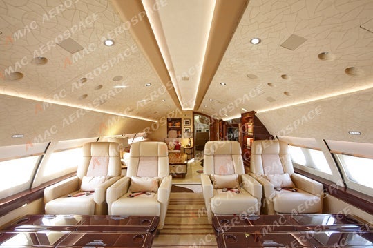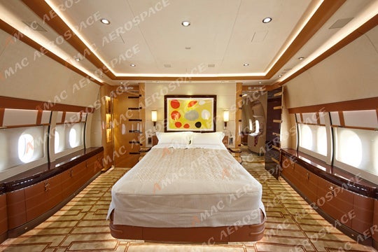 The plane also features a guest bedroom and private office. The bulk of the passenger seating is located on the upper deck and in the back of the plane, with seats arranged in a spacious 2-2-2 layout (2-2 on the upper deck) with ample leg room.