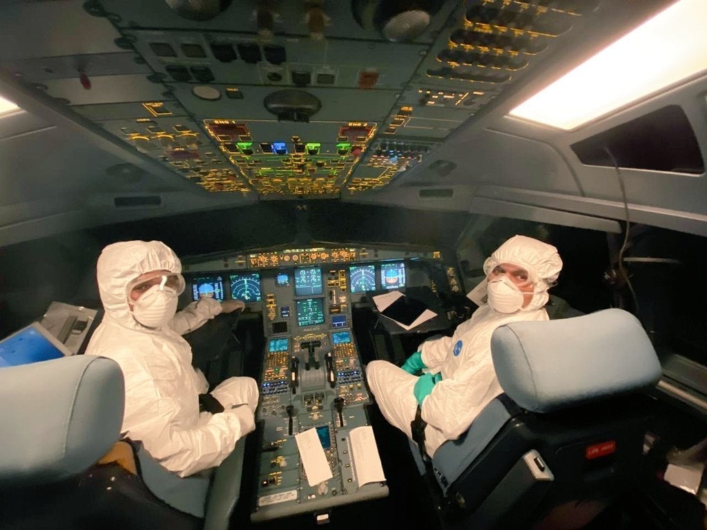 Even the pilots appeared to be wearing the same protective get-up, likely throughout the flight.