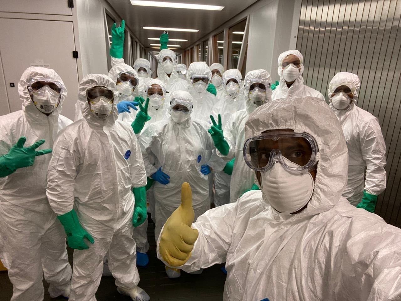 The crew members were dressed head to toe in protective gear, including full-body suits, masks, eye protection and gloves.