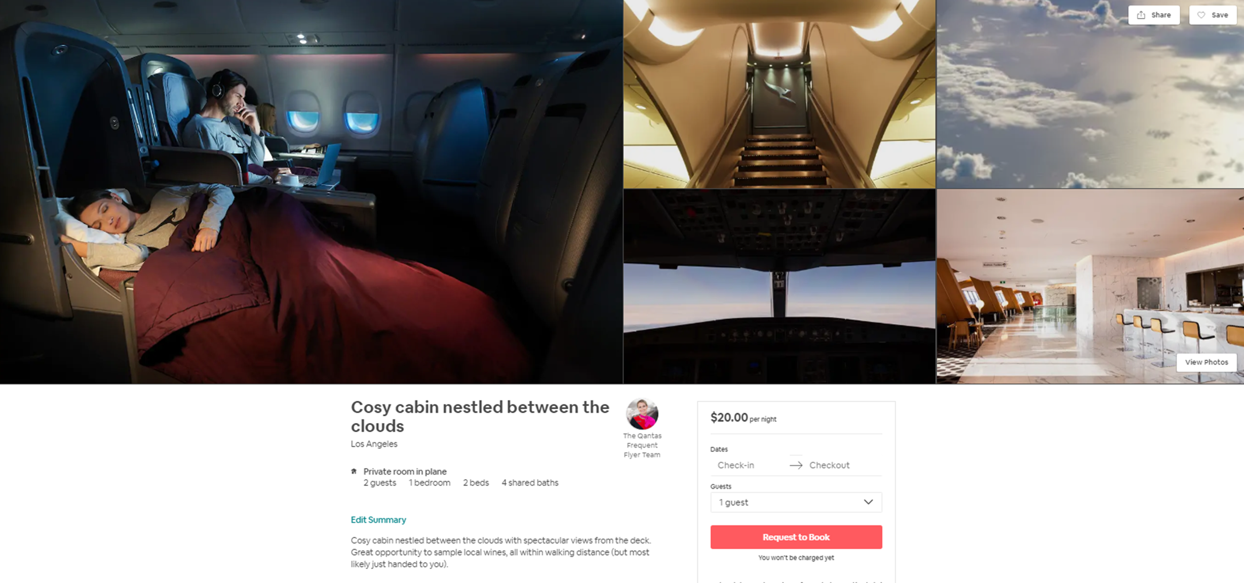 For the next two weeks, Qantas will be listing some of its first and business class seats on Airbnb for a fraction of the normal price; some bookings are more than 50 percent off. The listings, all for fully lie-flat seas, will be somewhat difficult to find on Airbnb and will only be open to Qantas frequent flyer members.