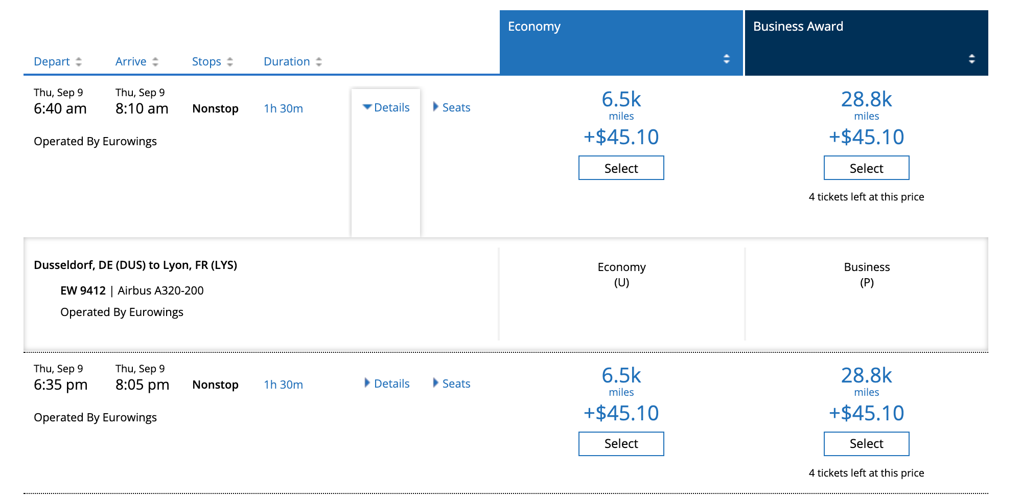 For now, tickets appear to start at 6,500 miles each way on the airline's short hauls within Europe. Eurowings Discover's flights between the U.S. and Europe do not appear to be loaded onto the schedule yet, but should price out at 33,000 MileagePlus miles each way in economy and 66,000 miles in business class.