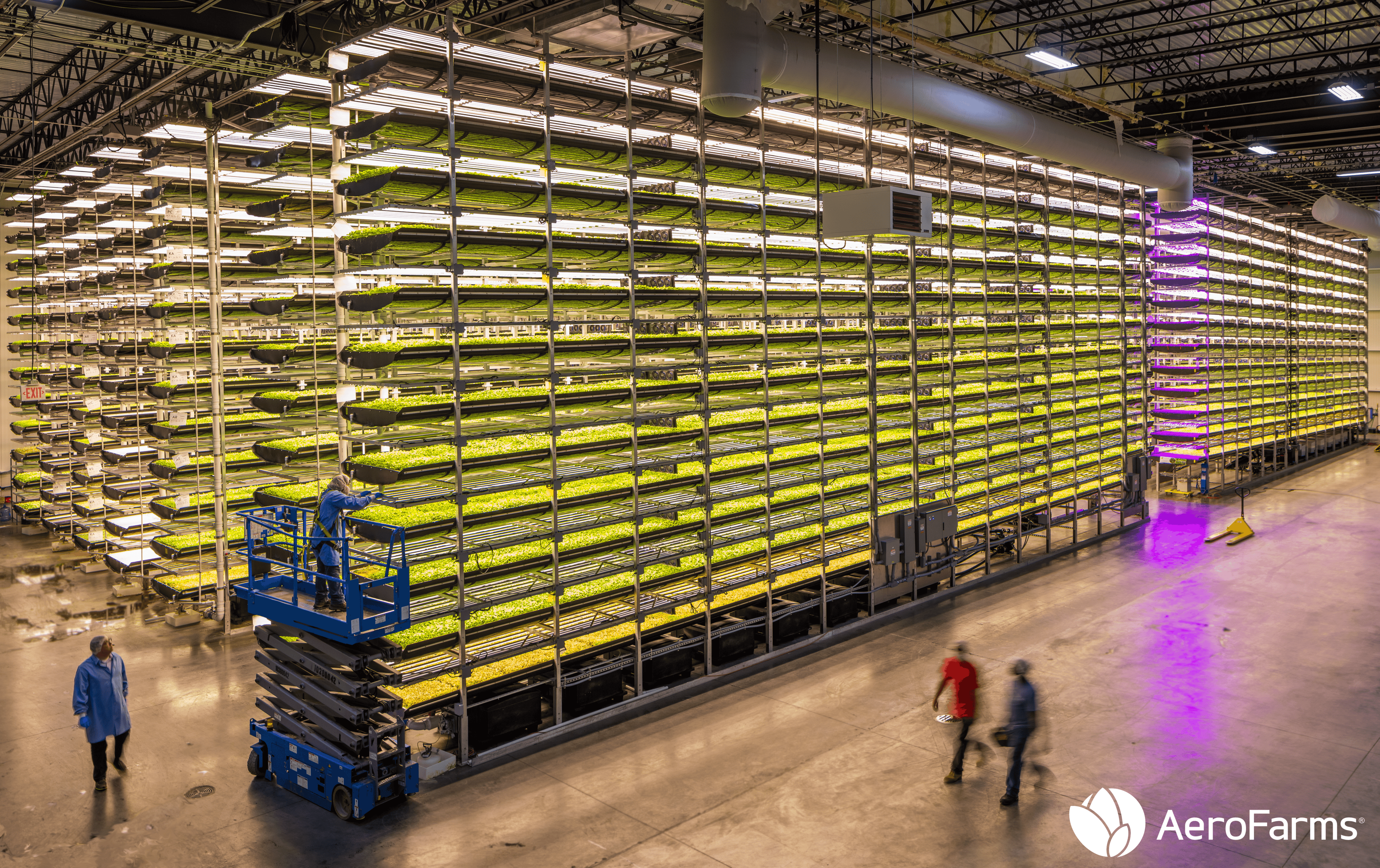The greens come from AeroFarms, an innovative "aeroponics" brand that turned an abandoned steel mill into an "indoor vertical farm." The company says the facility grows the equivalent of 390 acres of produce on a single acre of special "growing cloth medium" that uses calibrated LED lights, strict temperature and humidity controls, and a careful blend of water and nutrient spray in lieu of soil and sunshine.