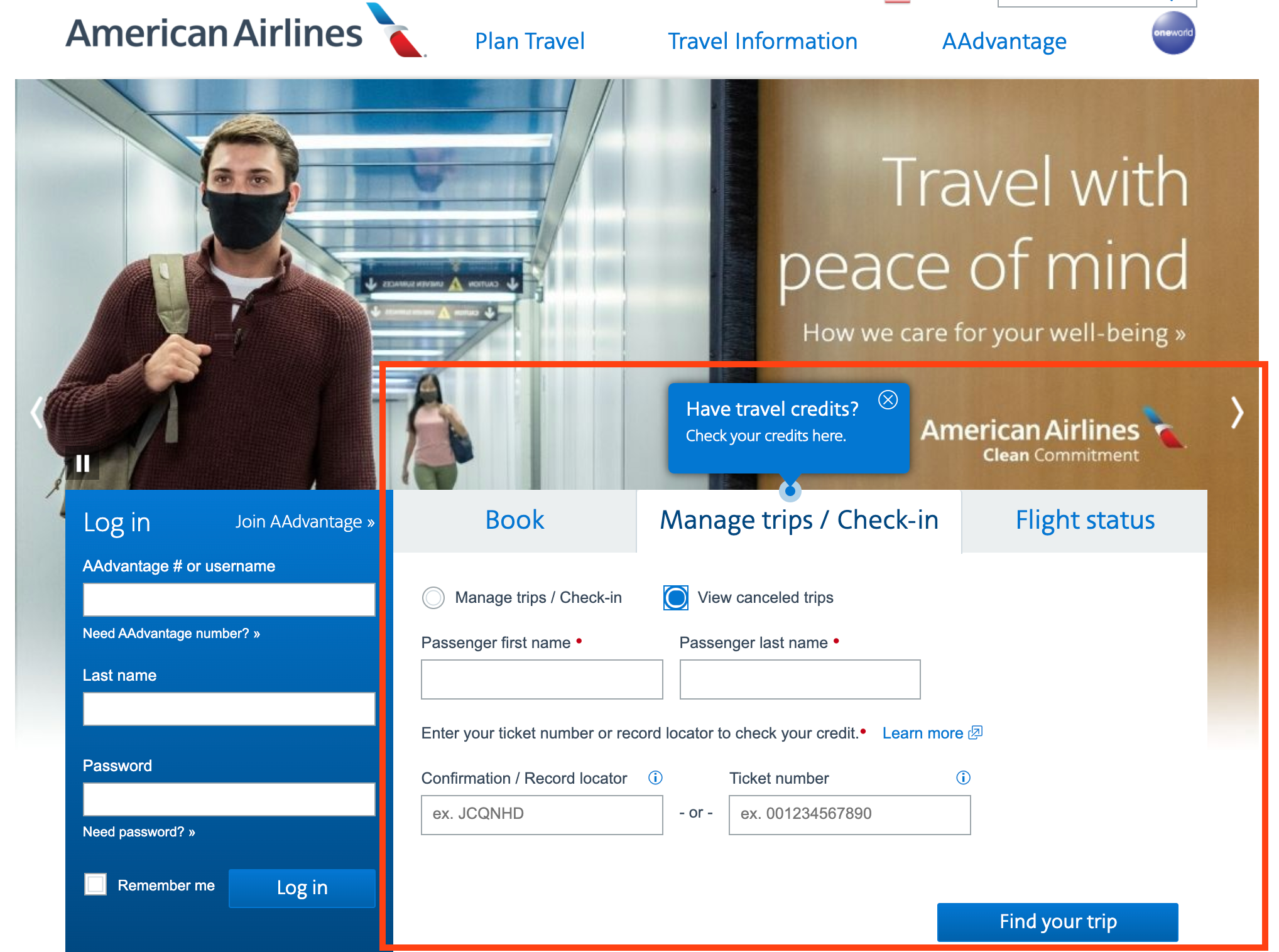 As first discovered by TPG, you can now check the value of flight credits on AA's site. In the "Manage trips/Check-in" box on the site's homepage, there's now an option to look up canceled flights. You can search by record locator or ticket number.