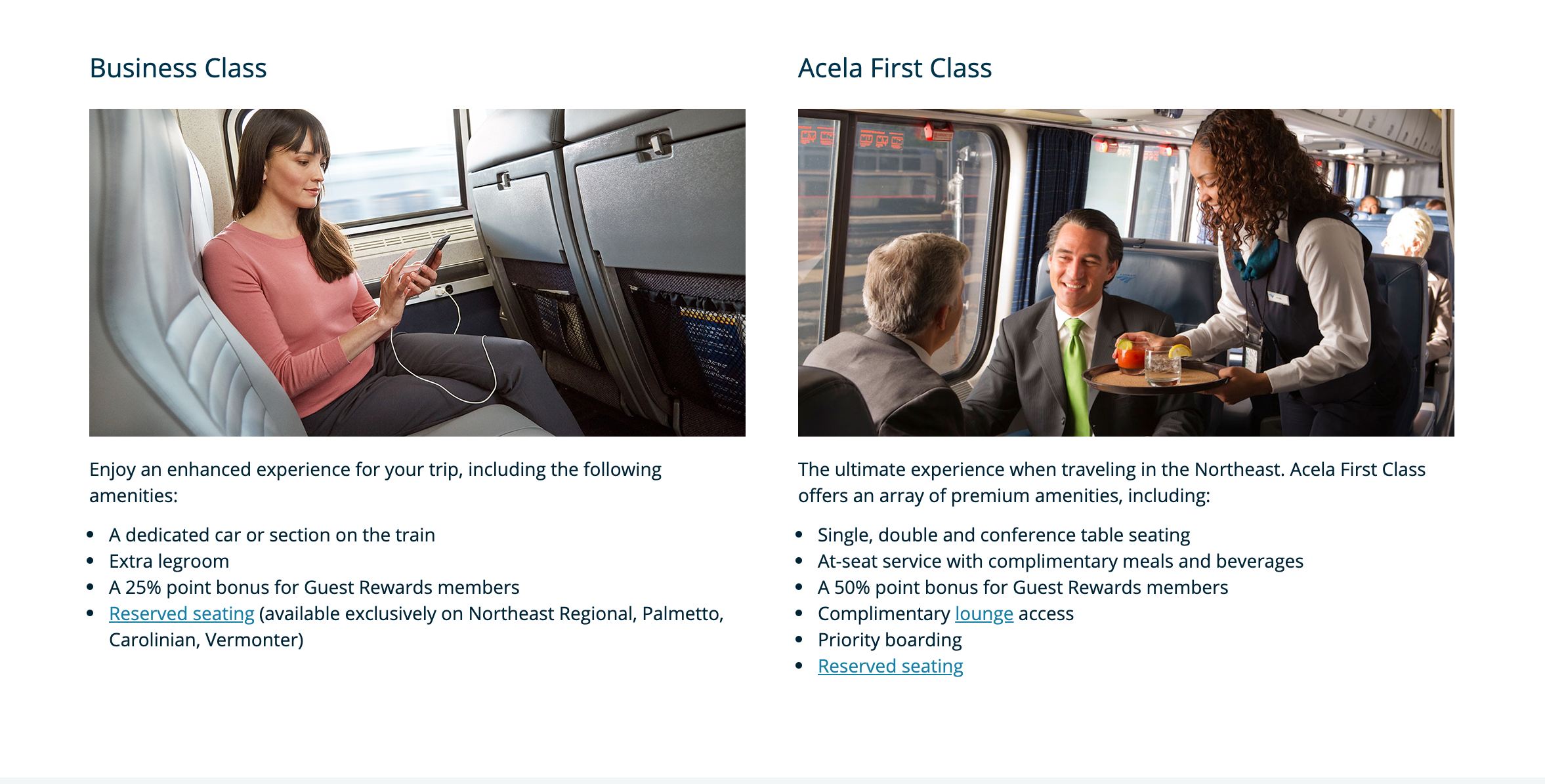 Business-class customers get dedicated cars or sections on the train with more legroom and reserved seating on the Northeast Regional, Palmetto, Carolinian and Vermonter train lines. They also get 25% bonus points.