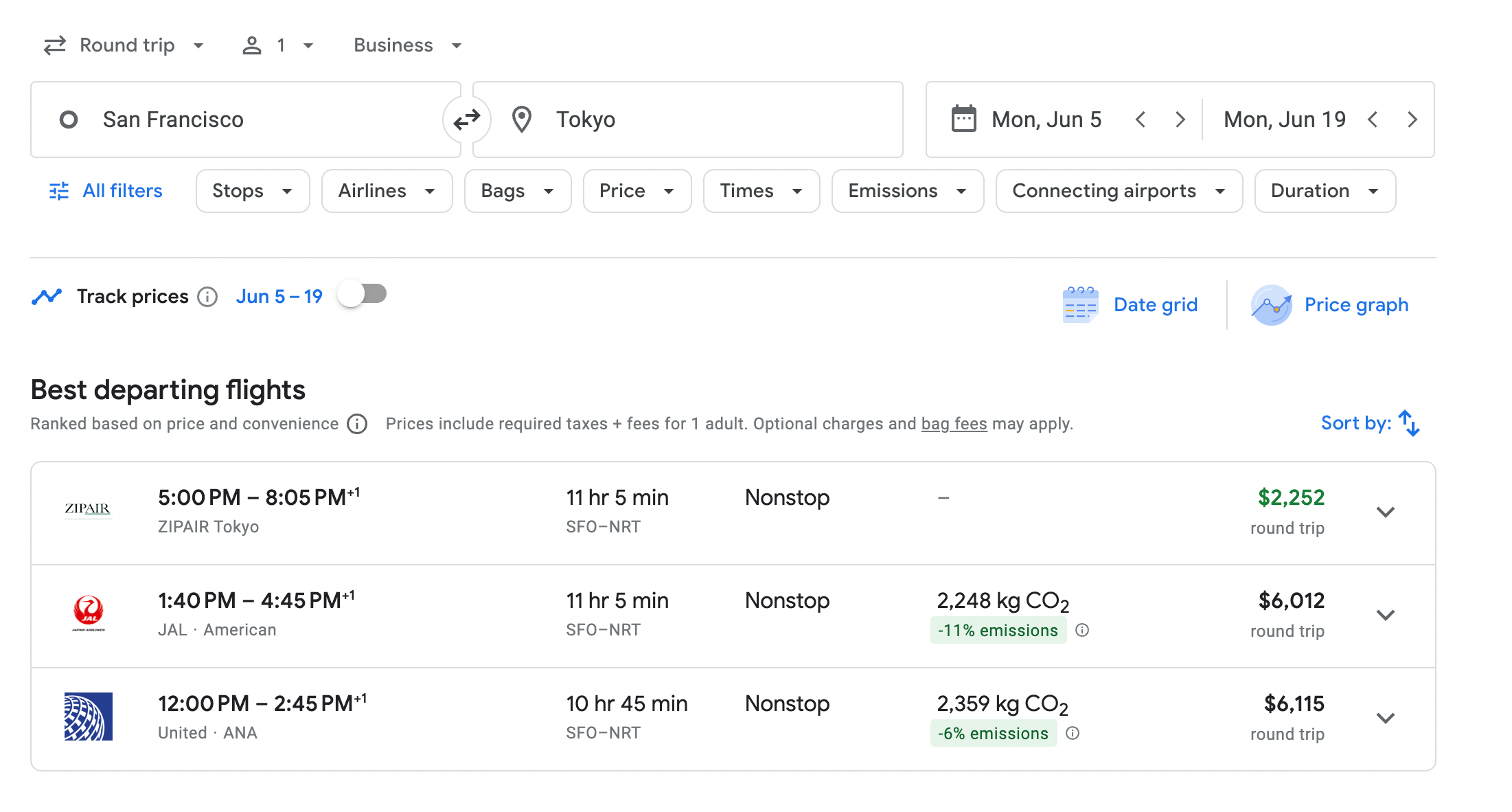 Otherwise, on Google Flights, business-class trips to Tokyo cost at least $4,000 round-trip (Zipair is also shown as the cheapest option).
