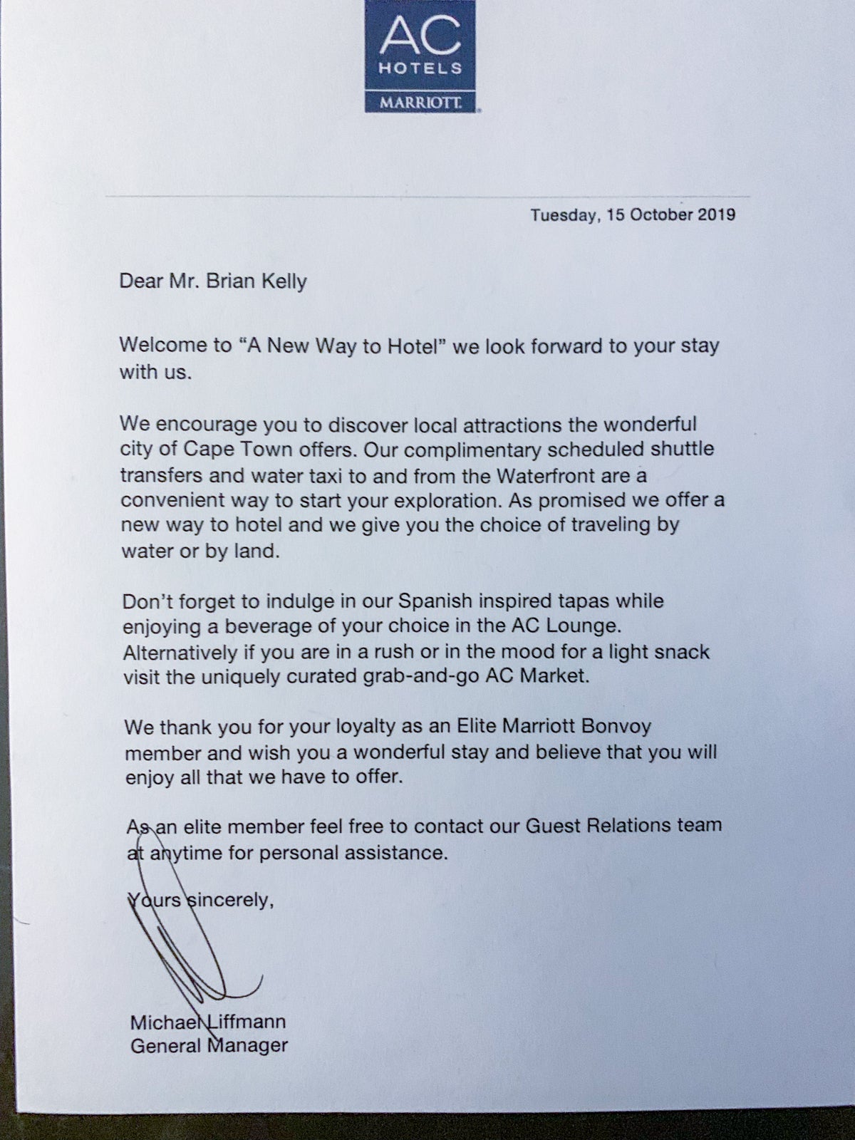 While I was in town for the 2018 conference, I noticed a new Marriott property under construction: the AC Hotel by Marriott Cape Town Waterfront. When it came time to plan this year's trip, I immediately remembered the new AC, which had opened in December 2018. I figured that we'd give this new property a try, since it surely would have its new-hotel kinks worked out almost a year after opening.
