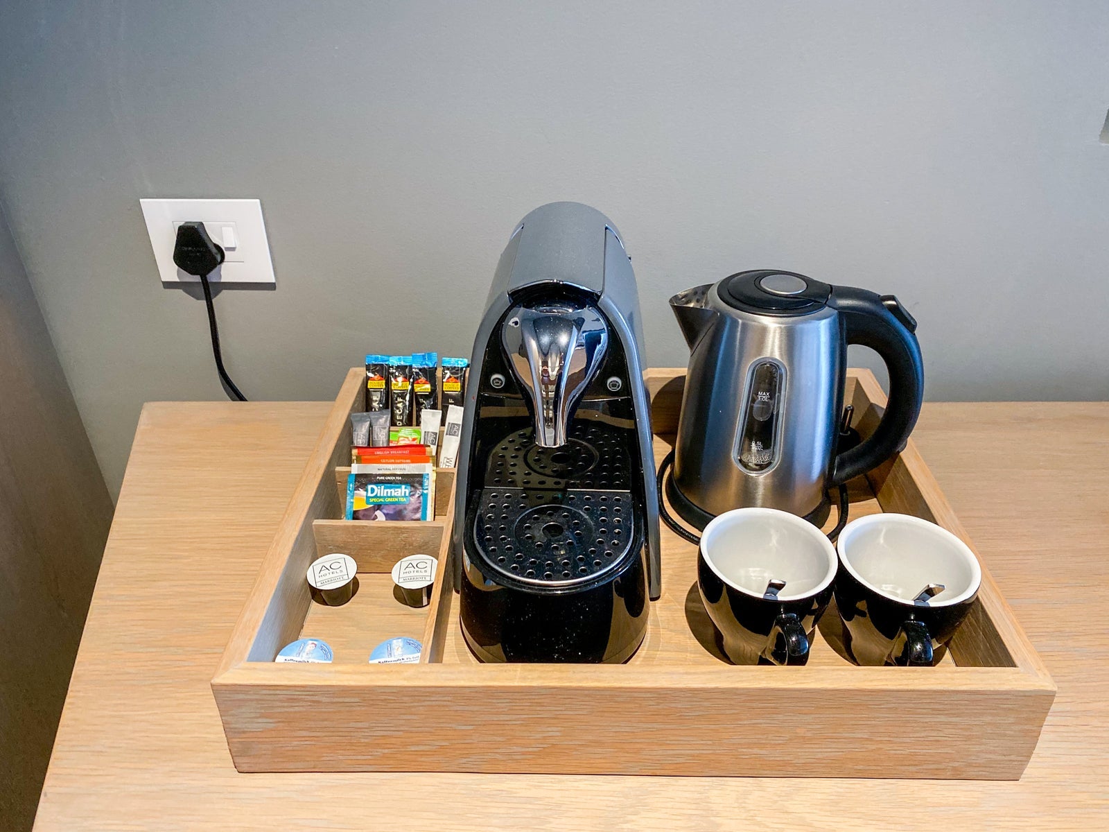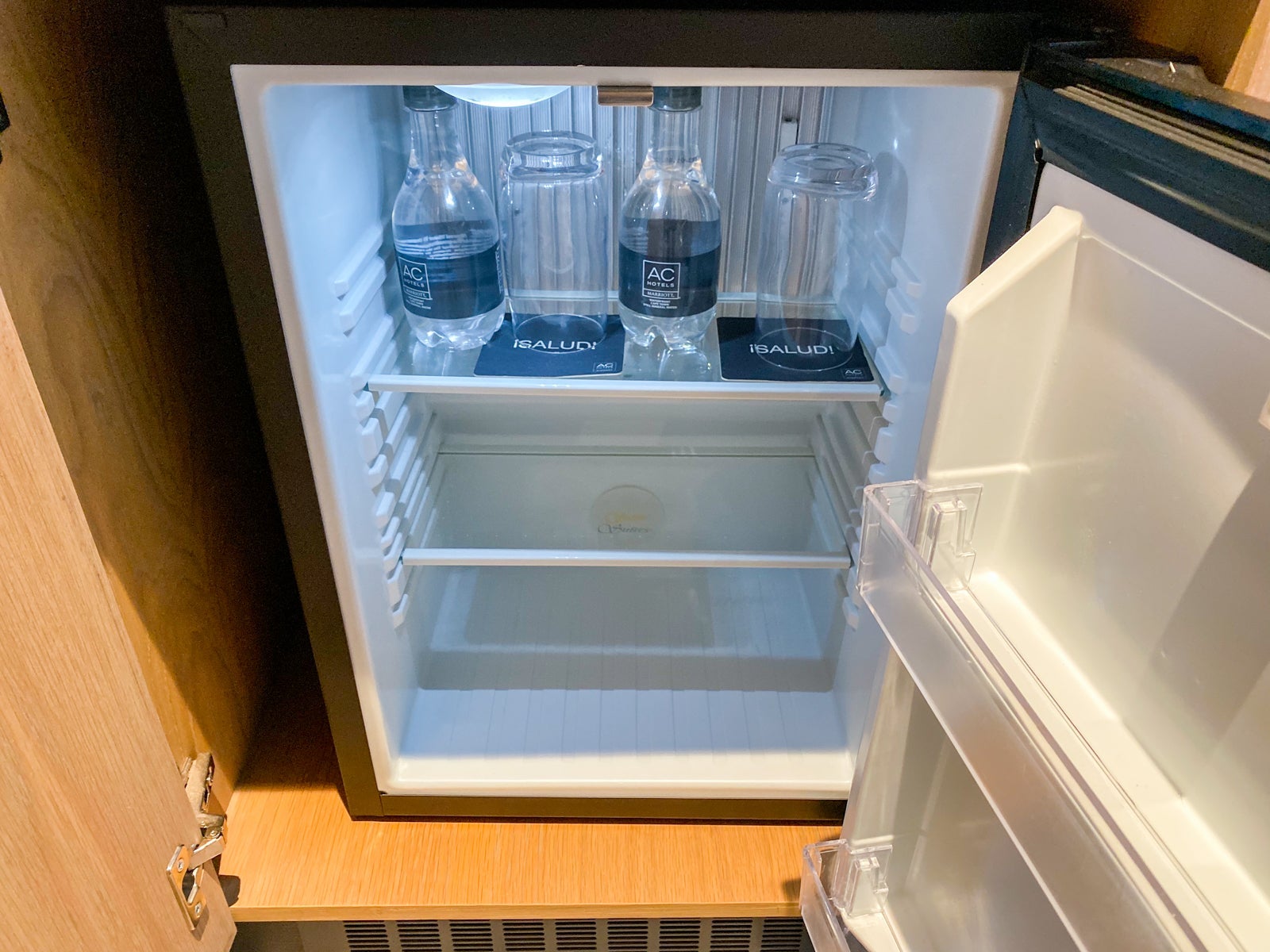 Near the desk, I found a teakettle, a Nespresso machine and a minifridge with two water bottles. I noticed the hotel had its own special AC-branded capsules for the Nespresso machine, and the coasters were an ode to the AC's Spanish heritage, saying "¡Salud!," which means "cheers" in Spanish.