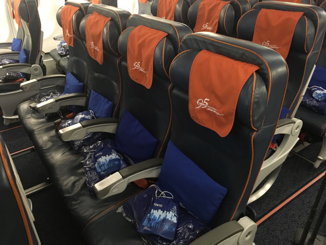 I lucked out on this flight and actually had two empty middle seats to enjoy. Plus, there was a particularly wide aisle behind me, because I was seated in the area where the aircraft's fuselage tapers. Because of this, the center section shrinks from four to three seats — perfect for stretching on this long-haul flight.